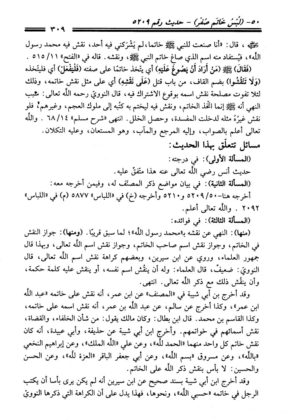 وَقَدْ أخرج ابن أبي شيبة بسند صحيح عن ابن سيرين أنه لم يكن يرى بأسا أن يكتب الرجل فِي خاتمه "حسبي الله"، ونحوها، فهذا يدلّ عَلَى أن الكراهة التي ذكرها النوويّ