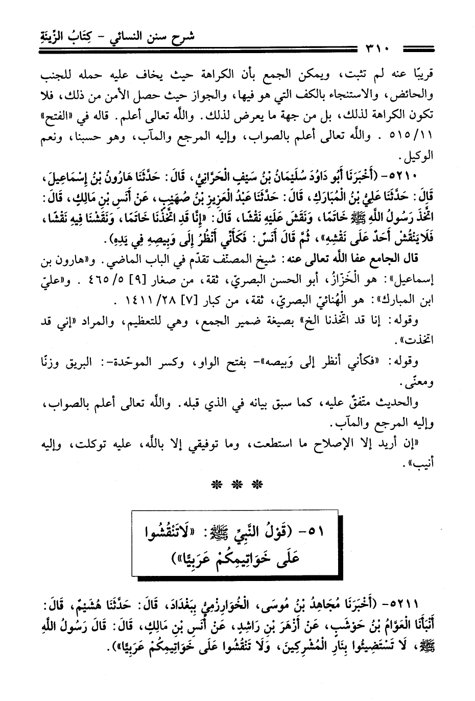 5210 - (أَخْبَرَنَا أَبُو دَاوُدَ سُلَيْمَانُ بْنُ سَيْفٍ الْحَرَّانِيُّ، قَالَ: حَدَّثَنَا هَارُونُ بْنُ إِسْمَاعِيلَ، قَالَ: حَدَّثَنَا عَلِيُّ بْنُ الْمُبَارَكِ، قَالَ: حَدَّثَنَا عَبْدُ الْعَزِيزِ بْنُ صُهَيْبٍ، عَنْ أَنَسِ بْنِ مَالِكٍ، قَالَ: اتَّخَذَ رَسُولُ اللَّهِ -صلى الله عليه وسلم- خَاتَمًا، وَنَقَشَ عَلَيْهِ نَقْشًا، قَالَ: "إِنَّا قَدِ اتَّخَذْنَا خَاتَمًا، وَنَقَشْنَا فِيهِ نَقْشًا، فَلاَ يَنْقُشْ أَحَدٌ عَلَى نَقْشِهِ"، ثُمَّ قَالَ أَنَسٌ: فَكَأَنِّي أَنْظُرُ إِلَى وَبِيصِهِ فِي يَدِهِ).