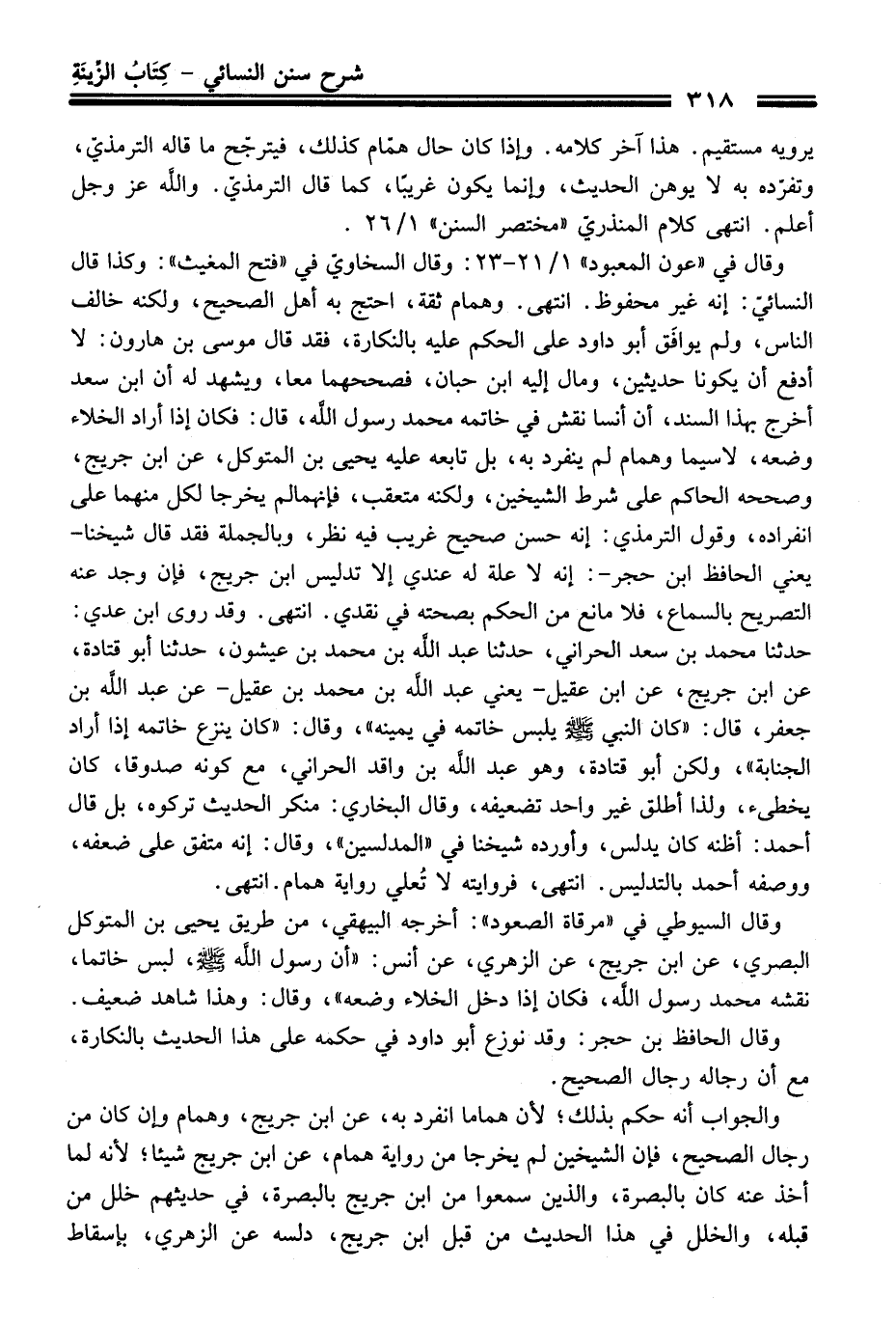 وَقَالَ فِي "عون المعبود" 1/ 21 - 23: وَقَالَ السخاويّ فِي "فتح المغيث": وكذا قَالَ النسائيّ: إنه غير محفوظ. انتهى. وهمام ثقة، احتج به أهل الصحيح، ولكنه خالف النَّاس، ولم يوافَق أبو داود عَلَى الحكم عليه بالنكارة، فقد قَالَ موسى بن هارون: لا أدفع أن يكونا حديثين، ومال إليه ابن حبّان، فصححهما معا، ويشهد له أن ابن سعد أخرج بهذا السند، أن أنسا نقش فِي خاتمه محمد رسول الله، قَالَ: فكان إذا أراد الخلاء وضعه، لاسيما وهمام لم ينفرد به، بل تابعه عليه يحيى بن المتوكل، عن ابن جريج، وصححه الحاكم عَلَى شرط الشيخين، ولكنه متعقب، فإنهما لم يخرجا لكل منهما عَلَى انفراده، وقول الترمذيّ: إنه حسن صحيح غريب فيه نظر، وبالجملة فقد قَالَ شيخنا -يعني الحافظ ابن حجر-: إنه لا علة له عندي إلا تدليس ابن جريج، فإن وجد عنه التصريح بالسماع، فلا مانع منْ الحكم بصحته فِي نقدي. انتهى. وَقَدْ رَوَى ابن عدي: حدثنا محمد بن سعد الحراني، حدثنا عبد الله بن محمد بن عيشون، حدثنا أبو قتادة، عن ابن جريج، عن ابن عقيل -يعني عبد الله بن محمد بن عقيل- عن عبد الله بن جعفر، قَالَ: "كَانَ النبيّ -صلى الله عليه وسلم- يلبس خاتمه فِي يمينه"، وَقَالَ: "كَانَ ينزع خاتمه إذا أراد الجنابة"، ولكن أبو قتادة، وهو عبد الله بن واقد الحراني، مع كونه صدوقا، كَانَ يخطيء، ولذا أطلق غير واحد تضعيفه، وَقَالَ البخاريّ: منكر الْحَدِيث تركوه، بل قَالَ أحمد: أظنه كَانَ يدلس، وأورده شيخنا فِي "المدلسين"، وَقَالَ: إنه متَّفقٌ عَلَى ضعفه، ووصفه أحمد بالتدليس. انتهى، فروايته لا تُعلي رواية همام. انتهى.