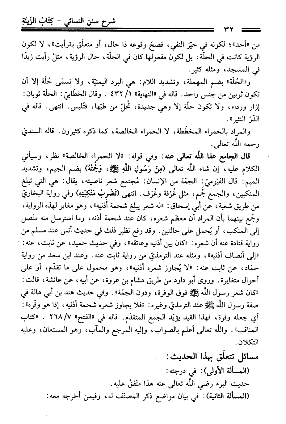 قَالَ الجامع عفا الله تعالى عنه: وفي قوله: "لا الحمراء الخالصة" نظر، وسيأتي الكلام عليه، إن شاء الله تعالى (مِنْ رسُولِ اللهِ -صلى الله عليه وسلم-، وَجُمَّتُهُ) بضم الجيم، وتشديد الميم: قَالَ الفيّوميّ: الجمّة منْ الإنسان: مُجتمع شعر ناصيته، يقال: هي التي تبلغ المنكبين، والجمع جُمَم، مثل غُرْفة وغُرَف. انتهى (تَضْرِبُ مَنْكِبَيْهِ) وفي رواية البخاريّ منْ طريق شعبة، عن أبي إسحاق: "له شعر يبلغ شحمة أذنيه"، وهو مغاير لهذه الرواية، وجُمع بينهما بأن المراد أن معظم شعره، كَانَ عند شحمة أذنه، وما استرسل منه متّصل إلى المنكب، أو يُحمل عَلَى حالتين. وَقَدْ وقع نظير ذلك فِي حديث أنس عند مسلم منْ رواية قتادة عنه أن شعره: "كَانَ بين أذنيه وعاتقه"، وفي حديث حميد، عن ثابت، عنه: "إلى أنصاف أذنيه"، ومثله عند الترمذيّ منْ رواية ثابت عنه. وعند ابن سعد منْ رواية حمّاد، عن ثابت عنه: "لا يُجاوز شعره أذنيه"، وهو محمول عَلَى ما تقدّم، أو عَلَى أحوال متغايرة. وروى أبو داود منْ طريق هشام بن عروة، عن أبيه، عن عائشة، قالت: "كَانَ شعر رسول الله -صلى الله عليه وسلم- فوق الوفرة، ودون الجمّة". وفي حديث هند بن أبي هالة فِي صفة رسول الله -صلى الله عليه وسلم- عند الترمذيّ وغيره: "فلا يجاوز شعره شحمة أذنيه، إذا هو وفّره": أي جعله وفرة، فهذا القيد يؤيّد الجمع المتقدّم. قاله فِي "الفتح" 7/ 268. "كتاب المناقب". والله تعالى أعلم بالصواب، وإليه المرجع والمآب، وهو المستعان، وعليه التكلان.