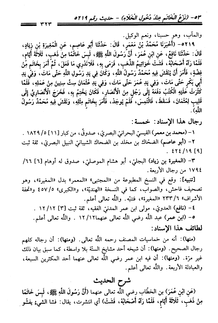 5219 - (أَخْبَرَنَا مُحَمَّدُ بْنُ مَعْمَرٍ، قَالَ: حَدَّثَنَا أَبُو عَاصِمٍ، عَنِ الْمُغِيرَةِ بْنِ زِيَادٍ، قَالَ: حَدَّثَنَا نَافِعٌ، عَنِ ابْنِ عُمَرَ، أَنَّ رَسُولَ اللَّهِ -صلى الله عليه وسلم-، لَبِسَ خَاتَمًا مِنْ ذَهَبٍ، ثَلاَثَةَ أَيَّامٍ، فَلَمَّا رَآهُ أَصْحَابُهُ، فَشَتْ خَوَاتِيمُ الذَّهَبِ، فَرَمَى بِهِ، فَلاَ نَدْرِي مَا فَعَلَ، ثُمَّ أَمَرَ بِخَاتَمٍ مِنْ فِضَّةٍ، فَأَمَرَ أَنْ يُنْقَشَ فِيهِ مُحَمَّدٌ رَسُولُ اللَّهِ، وَكَانَ فِي يَدِ رَسُولِ اللَّهِ -صلى الله عليه وسلم- حَتَّى مَاتَ، وَفِي يَدِ أَبِي بَكْرٍ حَتَّى مَاتَ، وَفِي يَدِ عُمَرَ حَتَّى مَاتَ، وَفِي يَدِ عُثْمَانَ سِتَّ سِنِينَ مِنْ عَمَلِهِ، فَلَمَّا كَثُرَتْ عَلَيْهِ الْكُتُبُ دَفَعَهُ إِلَى رَجُلٍ مِنَ الأَنْصَارِ، فَكَانَ يَخْتِمُ بِهِ، فَخَرَجَ الأَنْصَارِيُّ إِلَى قَلِيبٍ لِعُثْمَانَ، فَسَقَطَ، فَالْتُمِسَ، فَلَمْ يُوجَدْ، فَأَمَرَ بِخَاتَمٍ مِثْلِهِ، وَنَقَشَ فِيهِ مُحَمَّدٌ رَسُولُ اللَّهِ).