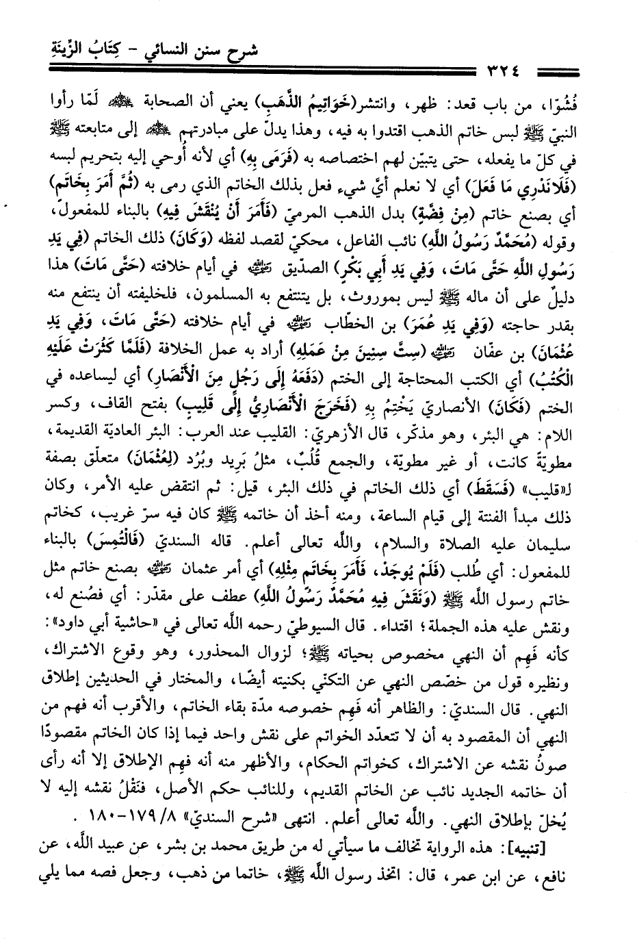فُشُوّا، منْ باب قعد: ظهر، وانتشر (خَوَاتِيمُ الذَّهَبِ) يعني أن الصحابة -رضي الله عنهم- لما رأوا النبيّ -صلى الله عليه وسلم- لبس خاتم الذهب اقتدوا به فيه، وهذا يدلّ عَلَى مبادرتهم -رضي الله عنهم- إلى متابعته -صلى الله عليه وسلم- فِي كلّ ما يفعله، حَتَّى يتبيّن لهم اختصاصه به (فَرَمَى بِهِ) أي لأنه أُوحي إليه بتحريم لبسه (فَلاَ نَدْرِي مَا فَعَلَ) أي لا نعلم أيَّ شيء فعل بذلك الخاتم الذي رمى به (ثُمَّ أَمَرَ بِخَاتَمٍ) أي بصنع خاتم (مِنْ فِضَّةٍ) بدل الذهب المرميّ (فَأَمَرَ أَنْ يُنْقَشَ فِيهِ) بالبناء للمفعول، وقوله (مُحَمَّدٌ رَسُولُ اللَّهِ) نائب الفاعل، محكي لقصد لفظه (وَكَانَ) ذلك الخاتم (فِي يَدِ رَسُولِ اللَّهِ -صلى الله عليه وسلم- حَتَّى مَاتَ وَفِي يَدِ أَبِى بَكْرٍ) الصديق -رضي الله عنه- فِي أيام خلافته (حَتَّى مَاتَ) هَذَا دليلٌ عَلَى أن ماله -صلى الله عليه وسلم- ليس بموروث، بل يتنتفع به المسلمون، فلخليفته أن ينتفع منه بقدر حاجته (وفِي يَدِ عُمَرَ) بن الخطّاب -رضي الله عنه- فِي أيام خلافته (حَتَّى مَاتَ، وفِي يَدِ عُثْمَانَ) بن عفّان -رضي الله عنه- (سِتَّ سِنِينَ مِنْ عَمَلِهِ) أراد به عمل الخلافة (فَلَمَّا كَثُرَتْ عَلَيْهِ الْكُتُبُ) أي الكتب المحتاجة إلى الختم (دَفَعَهُ إِلَى رَجُلٍ مِنَ الأَنْصَارِ) أي ليساعده فِي الختم (فَكَانَ) الأنصاريّ يَخْتِمُ بِهِ (فَخَرَجَ الأَنْصَارِيُّ إِلَى قَلِيبٍ) بفتح القاف، وكسر اللام: هي البئر، وهو مذكّر، قَالَ الأزهريّ: القليب عند العرب: البئر العاديّة القديمة، مطويّةً كانت، أو غير مطويّة، والجمع قُلُبٌ، مثلُ برِيد وبُرُد (لِعُثْمَان) متعلّق بصفة لـ"قليب" (فَسَقَطَ) أي ذلك الخاتم فِي ذلك البئر، قيل: ثم انتقض عليه الأمر، وكان ذلك مبدأ الفتنة إلى قيام الساعة، ومنه أخذ أن خاتمه -صلى الله عليه وسلم- كَانَ فيه سرّ غريب، كخاتم سليمان عليه الصلاة والسلام، والله تعالى أعلم. قاله السنديّ (فَالْتُمِسَ) بالبناء للمفعول: أي طُلب (فَلَمْ يُوجَدْ، فَأَمَرَ بِخَاتَمٍ مِثْلِهِ) أي أمر عثمان -رضي الله عنه- بصنع خاتم مثل خاتم رسول الله -صلى الله عليه وسلم- (وَنَقَشَ فِيهِ مُحَمَّدٌ رَسُولُ اللَّهِ) عطف عَلَى مقدّر: أي فصُنع له، ونقش عليه هذه الجملة؛ اقتداء. قَالَ السيوطيّ رحمه الله تعالى فِي "حاشية أبي داود": كأنه فَهِم أن النهي مخصوص بحياته -صلى الله عليه وسلم-؛ لزوال المحذور، وهو وقوع الاشتراك، ونظره قول منْ خصّص النهي عن التكنّي بكنيته أيضاً، والمختار فِي الحديثين إطلاق النهي. قَالَ السنديّ: والظاهر أنه فهِم خصوصه مدّة بقاء الخاتم، والأقرب أنه فهم منْ النهي أن المقصود به أن لا تتعدّد الخواتم عَلَى نقش واحد فيما إذا كَانَ الخاتم مقصوداً صونُ نقشه عن الاشتراك، كخواتم الحكام، والأظهر منه أنه فهِم الإطلاق إلا أنه رأى أن خاتمه الجديد نائب عن الخاتم القديم، وللنائب حكم الأصل، فنَقْلُ نقشه إليه لا يُخلّ بإطلاق النهي. والله تعالى أعلم. انتهى "شرح السنديّ" 8/ 179 - 180.