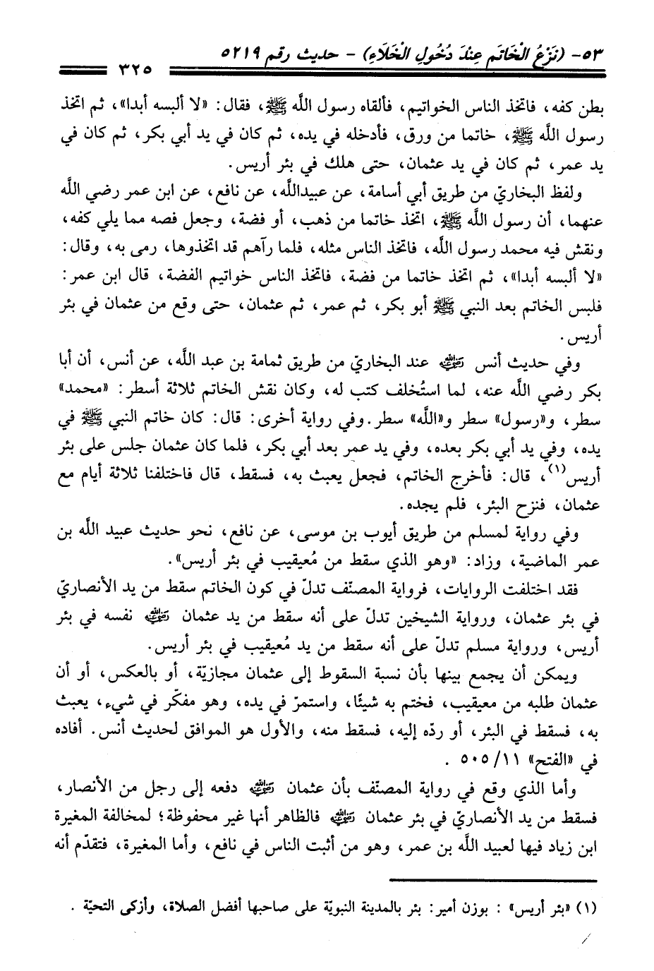 ولفظ البخاريّ منْ طريق أبي أسامة، عن عبيد الله، عن نافع، عن ابن عمر رضي الله عنهما، أن رسول الله -صلى الله عليه وسلم-، اتخذ خاتما منْ ذهب، أو فضة، وجعل فصه مما يلي كفه، ونقش فيه محمد رسول الله، فاتخذ النَّاس مثده، فلما رآهم قد اتخذوها، رمى به، وَقَالَ: "لا ألبسه أبدا"، ثم اتخذ خاتما منْ فضة، فاتخذ النَّاس خواتيم الفضة، قَالَ ابن عمر: فلبس الخاتم بعد النبيّ -صلى الله عليه وسلم- أبو بكر، ثم عمر، ثم عثمان، حَتَّى وقع منْ عثمان فِي بئر أريس.