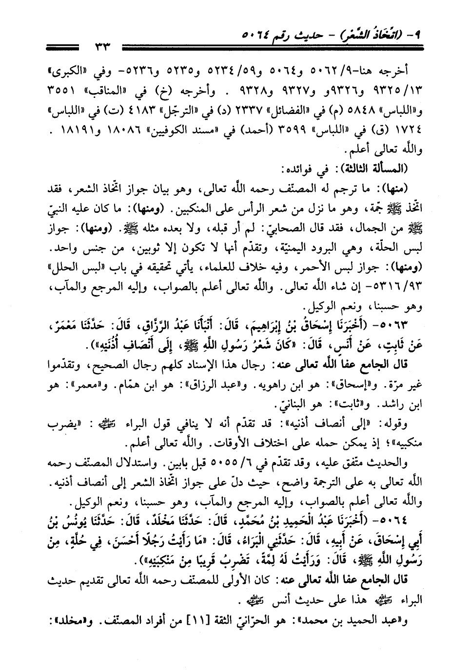 والحديث متَّفقٌ عليه، وَقَدْ تقدّم فِي 6/ 5055 قبل بابين. واستدلال المصنّف رحمه الله تعالى به عَلَى الترجمة واضح، حيث دلّ عَلَى جواز اتّخاذ الشعر إلى أنصاف أذنيه. والله تعالى أعلم بالصواب، وإليه المرجع والمآب، وهو حسبنا، ونعم الوكيل.