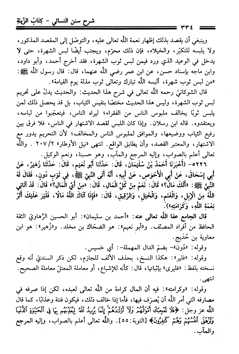 5226 - (أَخْبَرَنَا أَحْمَدُ بْنُ سُلَيْمَانَ، قَالَ: حَدَّثَنَا أَبُو نُعَيْمٍ، قَالَ: حَدَّثَنَا زُهَيْرٌ، عَنْ أَبِي إِسْحَاقَ، عَنْ أَبِي الأَحْوَصِ، عَنْ أَبِيهِ، أَنَّهُ أَتَى النَّبِيَّ -صلى الله عليه وسلم-، فِي ثَوْبٍ دُونٍ، فَقَالَ لَهُ النَّبِيُّ -صلى الله عليه وسلم-: "أَلَكَ مَالٌ؟ "، قَالَ: نَعَمْ مِنْ كُلِّ الْمَالِ، قَالَ: "مِنْ أَيِّ الْمَالِ؟ "، قَالَ قَدْ آتَانِيَ اللَّهُ مِنَ الإِبِلِ، وَالْغَنَمِ، وَالْخَيْلِ، وَالرَّقِيقِ، قَالَ: "فَإِذَا آتَاكَ اللَّهُ مَالاً، فَلْيُرَ عَلَيْكَ أَثَرُ نِعْمَةِ اللَّهِ، وَكَرَامَتِهِ").