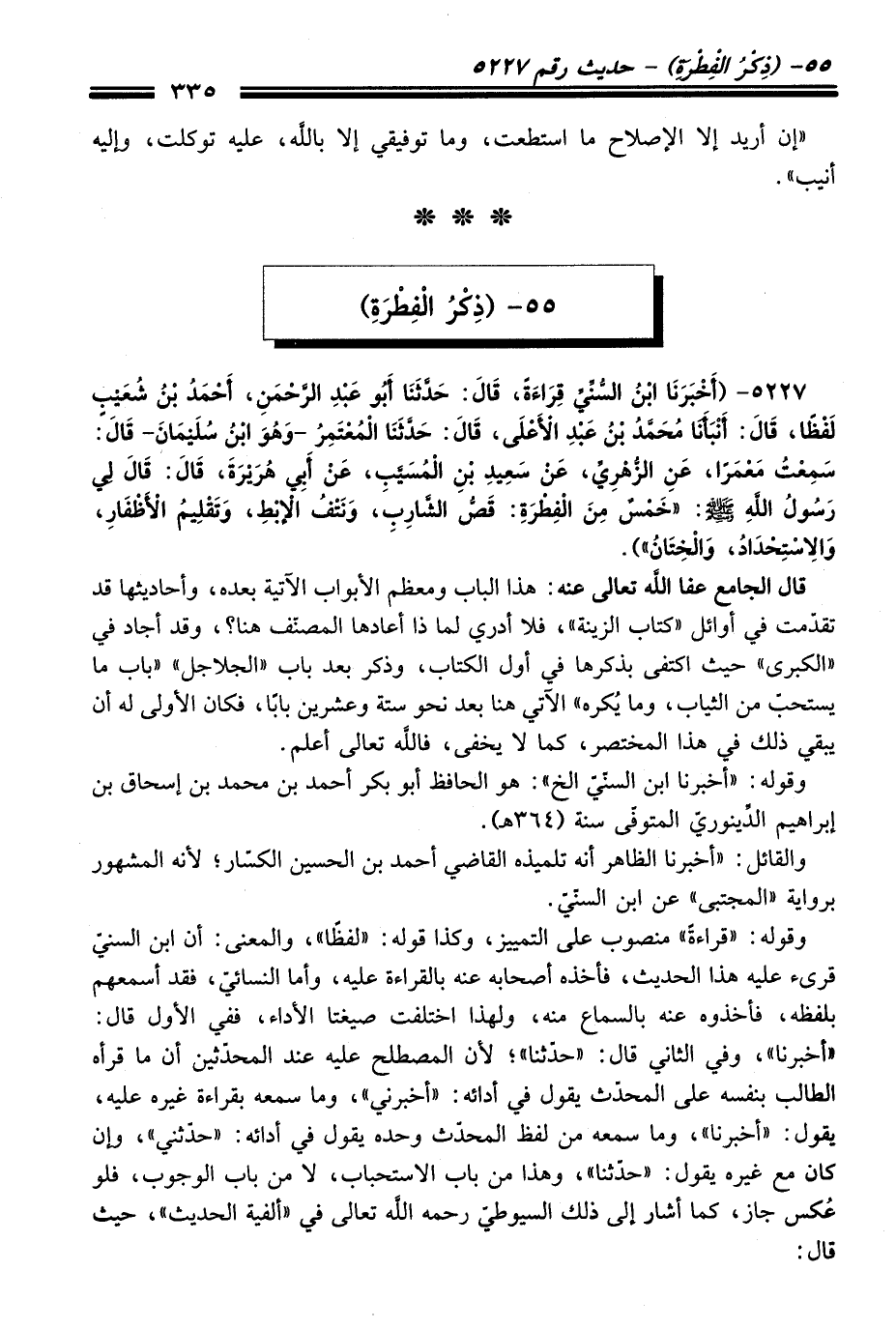 5227 - (أَخْبَرَنَا ابْنُ السُّنِّيِّ قِرَاءَةً، قَالَ: حَدَّثَنَا أَبُو عَبْدِ الرَّحْمَنِ، أَحْمَدُ بْنُ شُعَيْبٍ لَفْظًا، قَالَ: أَنْبَأَنَا مُحَمَّدُ بْنُ عَبْدِ الأَعْلَى، قَالَ: حَدَّثَنَا الْمُعْتَمِرُ -وَهُوَ ابْنُ سُلَيْمَانَ- قَالَ: سَمِعْتُ مَعْمَرًا، عَنِ الزُّهْرِيِّ، عَنْ سَعِيدِ بْنِ الْمُسَيَّبِ، عَنْ أَبِي هُرَيْرَةَ، قَالَ: قَالَ لِي رَسُولُ اللَّهِ -صلى الله عليه وسلم-: "خَمْسٌ مِنَ الْفِطْرَةِ: قَصُّ الشَّارِبِ، وَنَتْفُ الإِبْطِ، وَتَقْلِيمُ الأَظْفَارِ، وَالاِسْتِحْدَادُ، وَالْخِتَانُ").