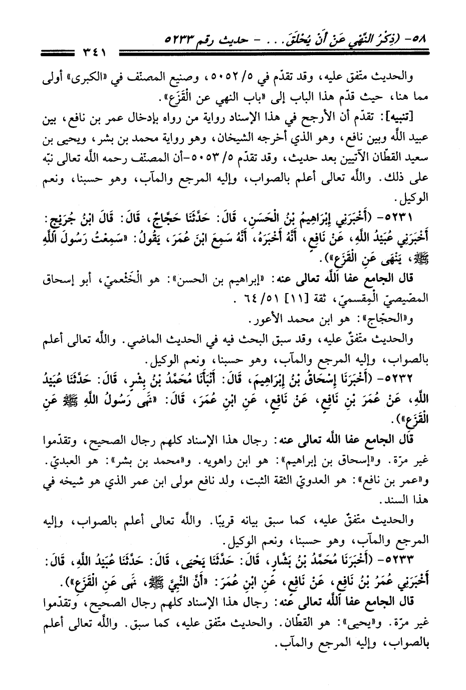 5231 - (أَخْبَرَنِي إِبْرَاهِيمُ بْنُ الْحَسَنِ، قَالَ: حَدَّثَنَا حَجَّاجٌ، قَالَ: قَالَ ابْنُ جُرَيْجٍ: أَخْبَرَنِي عُبَيْدُ اللَّهِ، عَنْ نَافِعٍ، أَنَّهُ أَخْبَرَهُ، أَنَّهُ سَمِعَ ابْنَ عُمَرَ، يَقُولُ: "سَمِعْتُ رَسُولَ اللَّهِ -صلى الله عليه وسلم-، يَنْهَى عَنِ الْقَزَعِ").