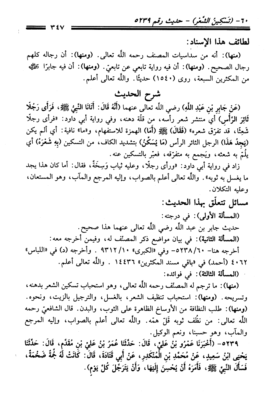(عَنْ جَابِرِ بْنِ عَبْدِ اللَّهِ) رضي الله تعالى عنهما (أَنَّهُ قَالَ: أَتَانَا النَّبِيُّ -صلى الله عليه وسلم-، فَرَأَى رَجُلاً ثَائِرَ الرَّأْسِ) أي منتشر شعر رأسه، منْ قلّة دهنه، وفي رواية أبي داود: "فرأى رجلاً شَعِثاً، قد تفرّق شعره" (فَقَالَ) -صلى الله عليه وسلم- (أَمَا) الهمزة للاستفهام، و"ما" نافية: أي ألم يكن (يَجِدُ هَذَا) الرجل الثاثر الرأس (مَا يُسَكِّنُ) بتشديد الكاف، منْ التسكين (بِهِ شَعْرَهُ) أي يلُمّ به شعثه، ويجمع به متفرّقه، فعبّر بالتسكين عنه.