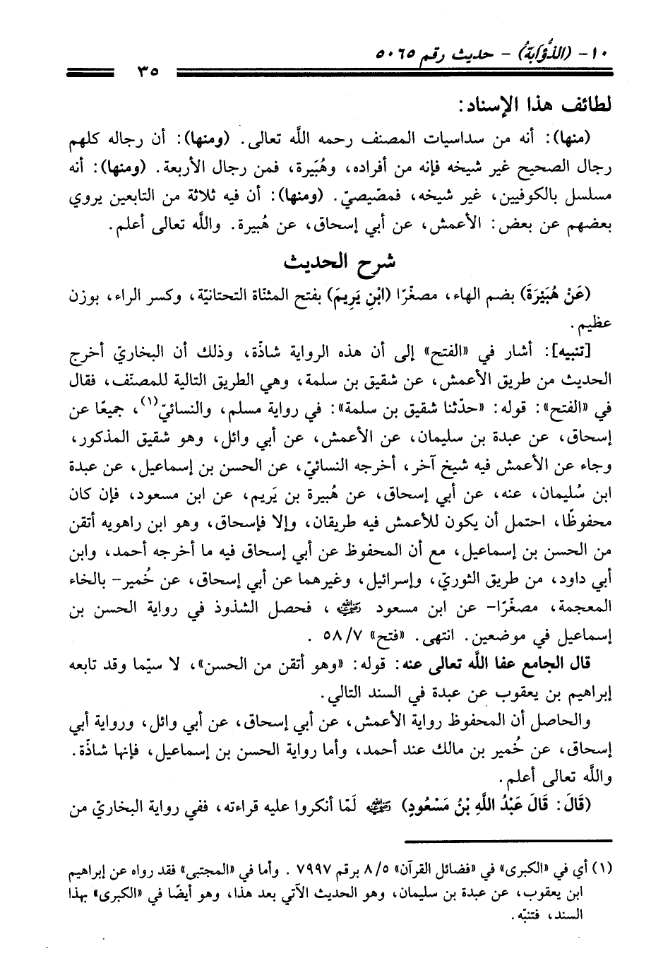 [تنبيه]: أشار فِي "الفتح" إلى أن هذه الرواية شاذّة، وذلك أن البخاريّ أخرج الْحَدِيث منْ طريق الأعمش، عن شقيق بن سلمة، وهي الطريق التالية للمصنّف، فَقَالَ فِي "الفتح": قوله: "حدثنا شقيق بن سلمة": فِي رواية مسلم، والنسائيّ (¬1)، جميعًا عن إسحاق، عن عبدة بن سليمان، عن الأعمش، عن أبي وائل، وهو شقيق المذكور، وجاء عن الأعمش فيه شيخ آخر، أخرجه النسائيّ، عن الحسن بن إسماعيل، عن عبدة ابن سُليمان، عنه، عن أبي إسحاق، عن هُبيرة بن يَريم، عن ابن مسعود، فإن كَانَ محفوظاً، احتمل أن يكون للأعمش فيه طريقان، وإلا فإسحاق، وهو ابن راهويه أتقن منْ الحسن بن إسماعيل، مع أن المحفوظ عن أبي إسحاق فيه ما أخرجه أحمد، وابن أبي داود، منْ طريق الثوريّ، وإسرائيل، وغيرهما عن أبي إسحاق، عن خُمير -بالخاء المعجمة، مصغّرًا- عن ابن مسعود -رضي الله عنه-، فحصل الشذوذ فِي رواية الحسن بن إسماعيل فِي موضعين. انتهى. "فتح" 7/ 58.