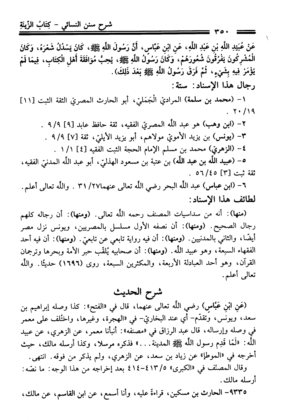 عَنْ عُبَيْدِ اللَّهِ بْنِ عَبْدِ اللَّهِ، عَنِ ابْنِ عَبَّاسٍ، أَنَّ رَسُولَ اللَّهِ -صلى الله عليه وسلم-، كَانَ يَسْدُلُ شَعْرَهُ، وَكَانَ الْمُشْرِكُونَ يَفْرُقُونَ شُعُورَهُمْ، وَكَانَ رَسُولُ اللَّهِ -صلى الله عليه وسلم-، يُحِبُّ مُوَافَقَةَ أَهْلِ الْكِتَابِ، فِيمَا لَمْ يُؤْمَرْ فِيهِ بِشَيْءٍ، ثُمَّ فَرَقَ رَسُولُ اللَّهِ -صلى الله عليه وسلم- بَعْدَ ذَلِكَ).