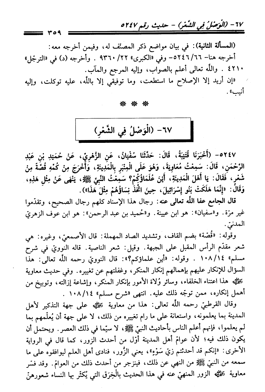 5247 - (أَخْبَرَنَا قُتَيْبَةُ، قَالَ: حَدَّثَنَا سُفْيَانُ، عَنِ الزُّهْرِيِّ، عَنْ حُمَيْدِ بْنِ عَبْدِ الرَّحْمَنِ، قَالَ: سَمِعْتُ مُعَاوِيَةَ، وَهُوَ عَلَى الْمِنْبَرِ بِالْمَدِينَةِ، وَأَخْرَجَ مِنْ كُمِّهِ قُصَّةً مِنْ شَعْرٍ، فَقَالَ: يَا أَهْلَ الْمَدِينَةِ، أَيْنَ عُلَمَاؤُكُمْ؟ سَمِعْتُ النَّبِيَّ -صلى الله عليه وسلم-، يَنْهَى عَنْ مِثْلِ هَذِهِ، وَقَالَ: "إِنَّمَا هَلَكَتْ بَنُو إِسْرَائِيلَ، حِينَ اتَّخَذَ نِسَاؤُهُمْ مِثْلَ هَذَا").