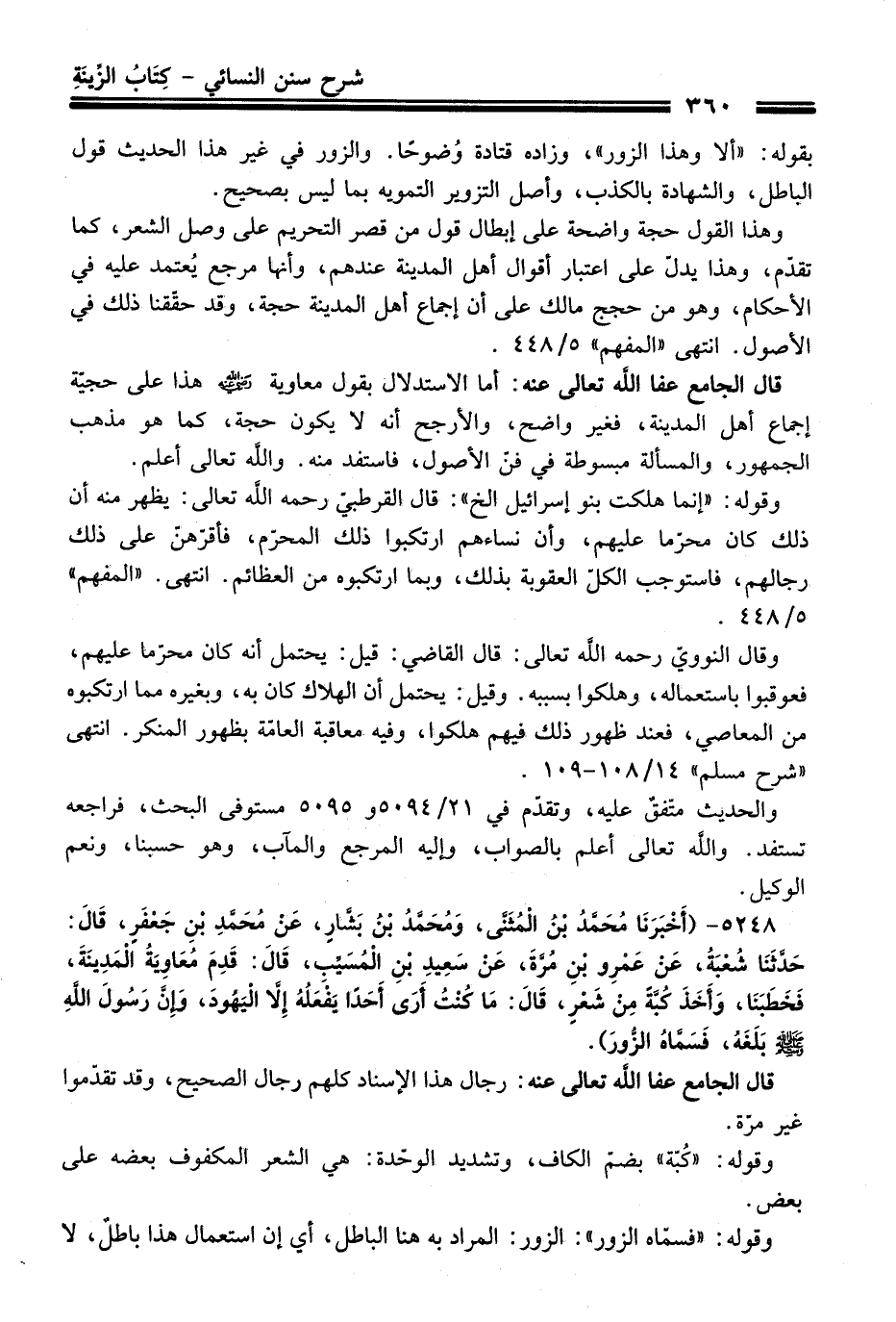 5248 - (أَخْبَرَنَا مُحَمَّدُ بْنُ الْمُثَنَّى، وَمُحَمَّدُ بْنُ بَشَّارٍ، عَنْ مُحَمَّدِ بْنِ جَعْفَرٍ، قَالَ: حَدَّثَنَا شُعْبَةُ، عَنْ عَمْرِو بْنِ مُرَّةَ، عَنْ سَعِيدِ بْنِ الْمُسَيَّبِ، قَالَ: قَدِمَ مُعَاوِيَةُ الْمَدِينَةَ، فَخَطَبَنَا، وَأَخَذَ كُبَّةً مِنْ شَعْرٍ، قَالَ: مَا كُنْتُ أَرَى أَحَدًا يَفْعَلُهُ إِلاَّ الْيَهُودَ، وَإِنَّ رَسُولَ اللَّهِ -صلى الله عليه وسلم- بَلَغَهُ، فَسَمَّاهُ الزُّورَ).