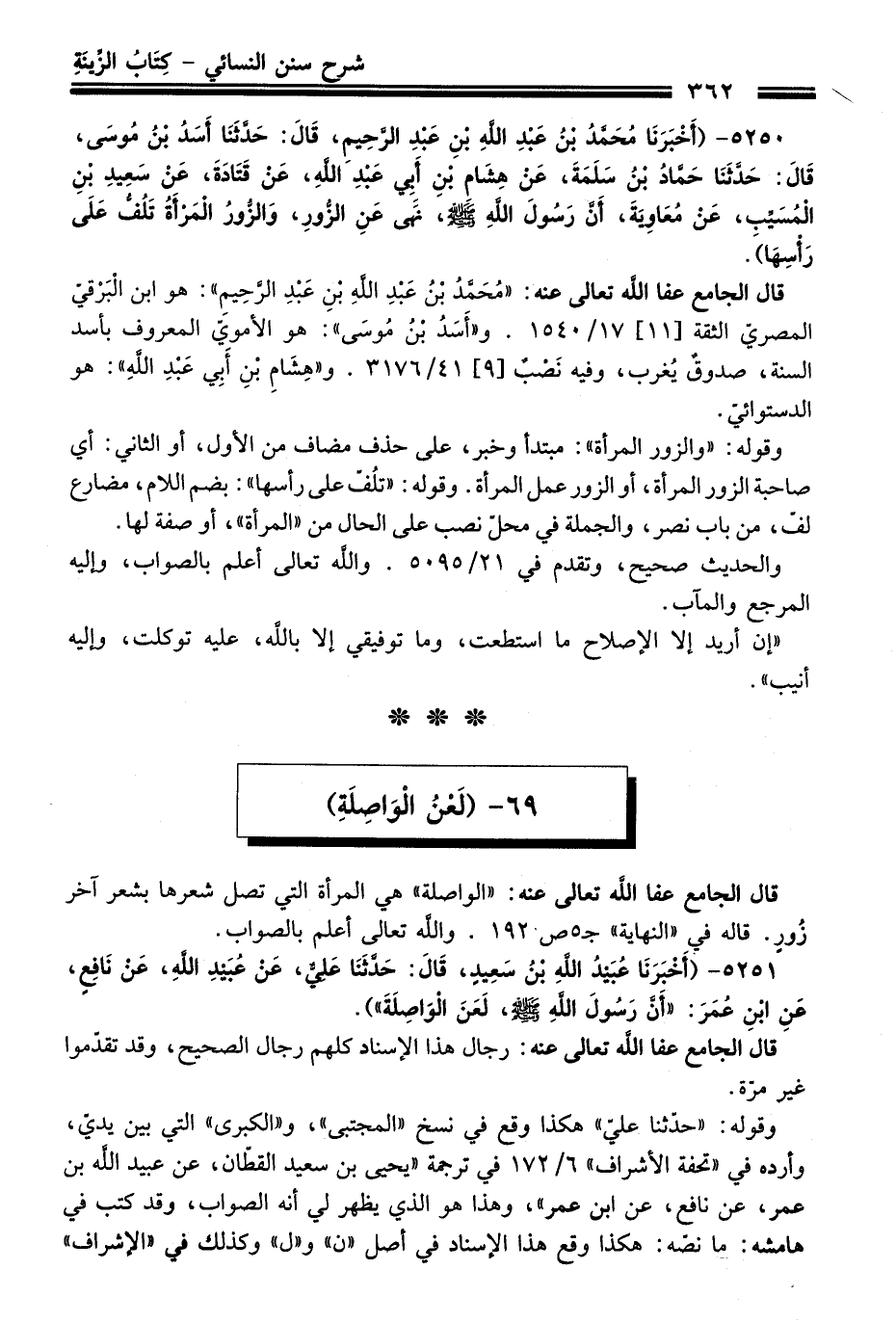 قَالَ الجامع عفا الله تعالى عنه: "الواصلة" هي المرأة التي تصل شعرها بشعر آخر زُورٍ. قاله فِي "النهاية" جـ 5 ص 192. والله تعالى أعلم بالصواب.