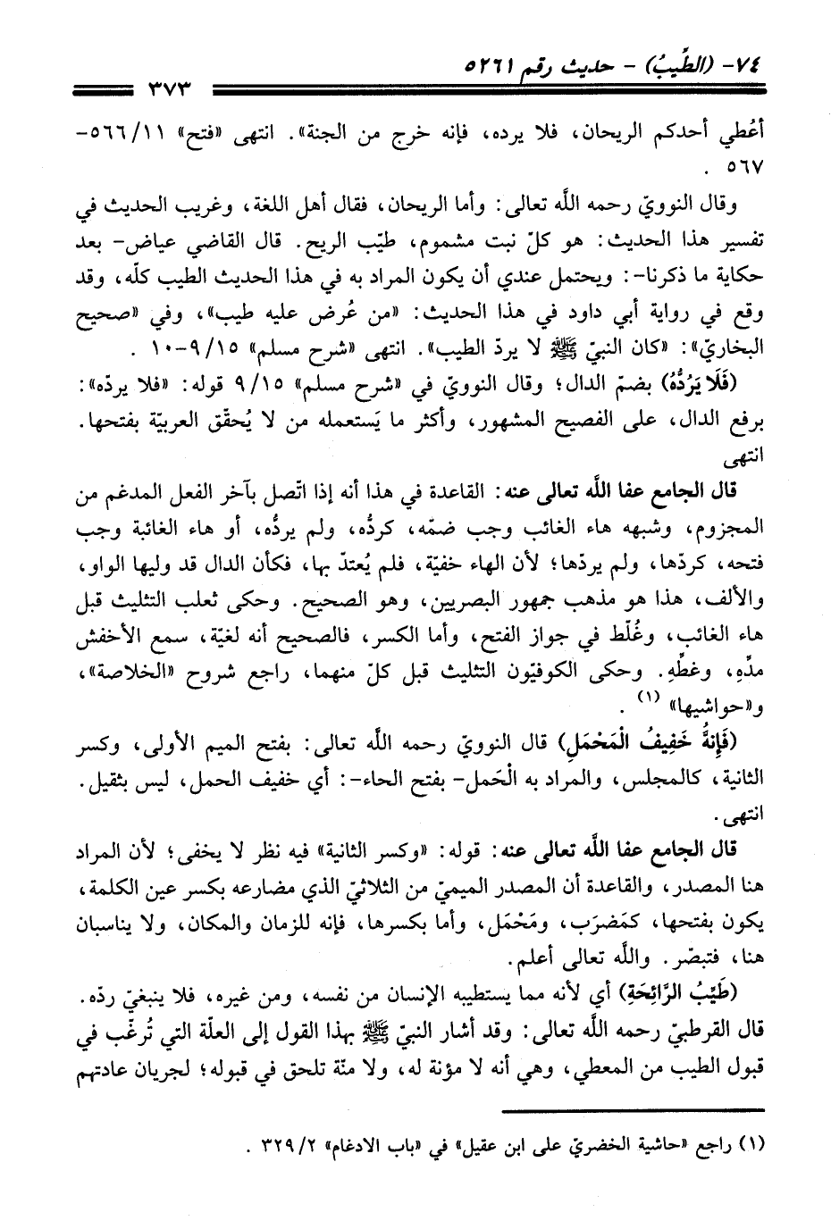 وَقَالَ النوويّ رحمه الله تعالى: وأما الريحان، فَقَالَ أهل اللغة، وغريب الْحَدِيث فِي تفسير هَذَا الْحَدِيث: هو كلّ نبت مشموم، طيّب الريح. قَالَ القاضي عياض -بعد حكاية ما ذكرنا-: ويحتمل عندي أن يكون المراد به فِي هَذَا الْحَدِيث الطيب كلّه، وَقَدْ وقع فِي رواية أبي داود فِي هَذَا الْحَدِيث: "منْ عُرض عليه طيب"، وفي "صحيح البخاريّ": "كَانَ النبيّ -صلى الله عليه وسلم- لا يردّ الطيب". انتهى "شرح مسلم" 15/ 9 - 10.