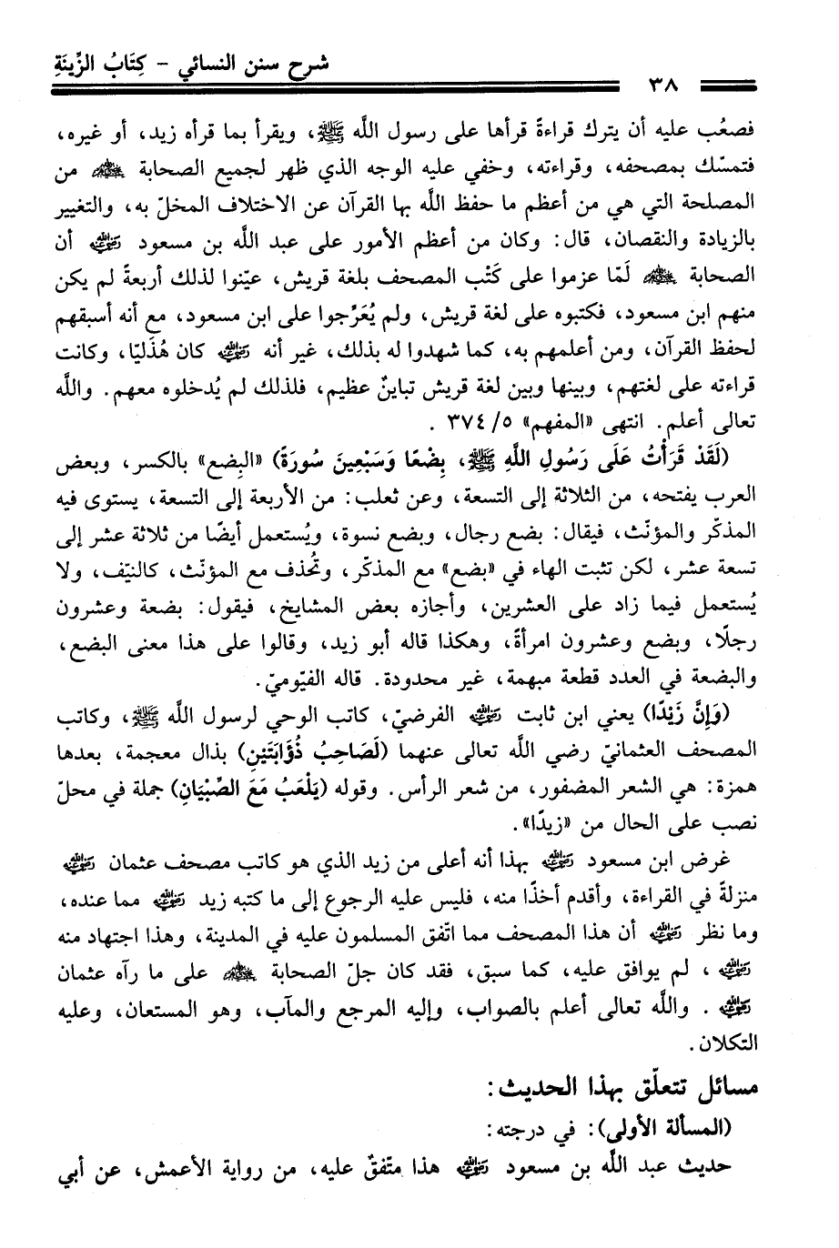 فصعُب عليه أن يترك قراءةً قرأها عَلَى رسول الله -صلى الله عليه وسلم-، ويقرأ بما قرأه زيد، أو غيره، فتمسك بمصحفه، وقراءته، وخفي عليه الوجه الذي ظهر لجميع الصحابة -رضي الله عنهم- منْ المصلحة التي هي منْ أعظم ما حفظ الله بها القرآن عن الاختلاف المخلّ به، والتغيير بالزيادة والنقصان، قَالَ: وكان منْ أعظم الأمور عَلَى عبد الله بن مسعود -رضي الله عنه- أن الصحابة -رضي الله عنهم- لَمّا عزموا عَلَى كتب المصحف بلغة قريش، عيّنوا لذلك أربعةً لم يكن منهم ابن مسعود، فكتبوه عَلَى لغة قريش، ولم يُعَرِّجوا عَلَى ابن مسعود، مع أنه أسبقهم لحفظ القرآن، ومن أعلمهم به، كما شهدوا له بذلك، غير أنه -رضي الله عنه- كَانَ هُذلَيًّا، وكانت قراءته عَلَى لغتهم، وبينها وبين لغة قريش تباينٌ عظيم، فلذلك لم يُدخلوه معهم. والله تعالى أعلم. انتهى "المفهم" 5/ 374.
