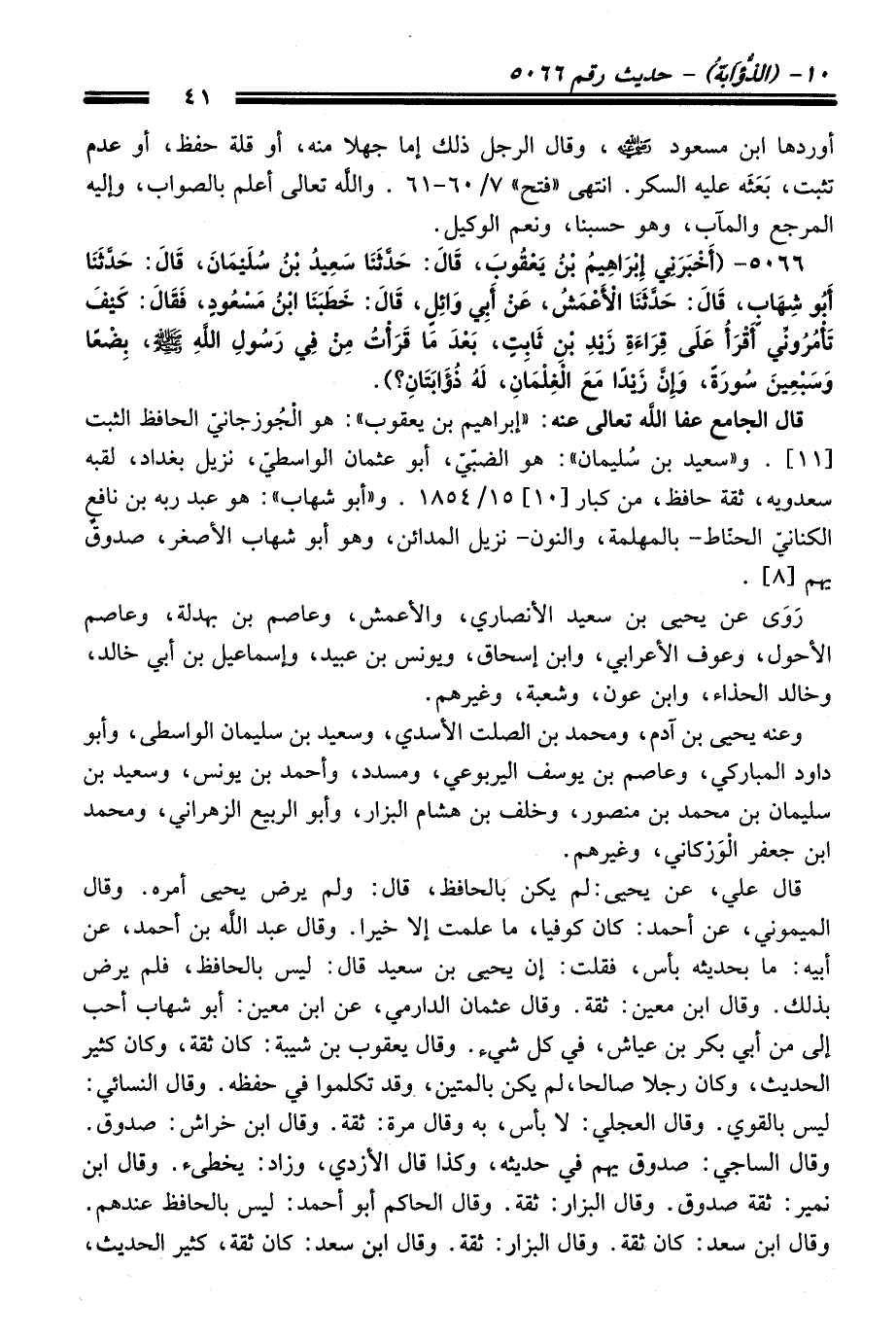 قَالَ الجامع عفا الله تعالى عنه: "إبراهيم بن يعقوب": هو الجُوزجانيّ الحافظ الثبت [11]. و"سعيد بن سُليمان": هو الضبّيّ، أبو عثمان الواسطيّ، نزيل بغداد، لقبه سعدويه، ثقة حافظ، منْ كبار [10] 15/ 1854. و"أبو شهاب": هو عبد ربه بن نافع الكنانيّ الحنّاط -بالمهلمة، والنون- نزيل المدائن، وهو أبو شهاب الأصغر، صدوقٌ يهم [8].