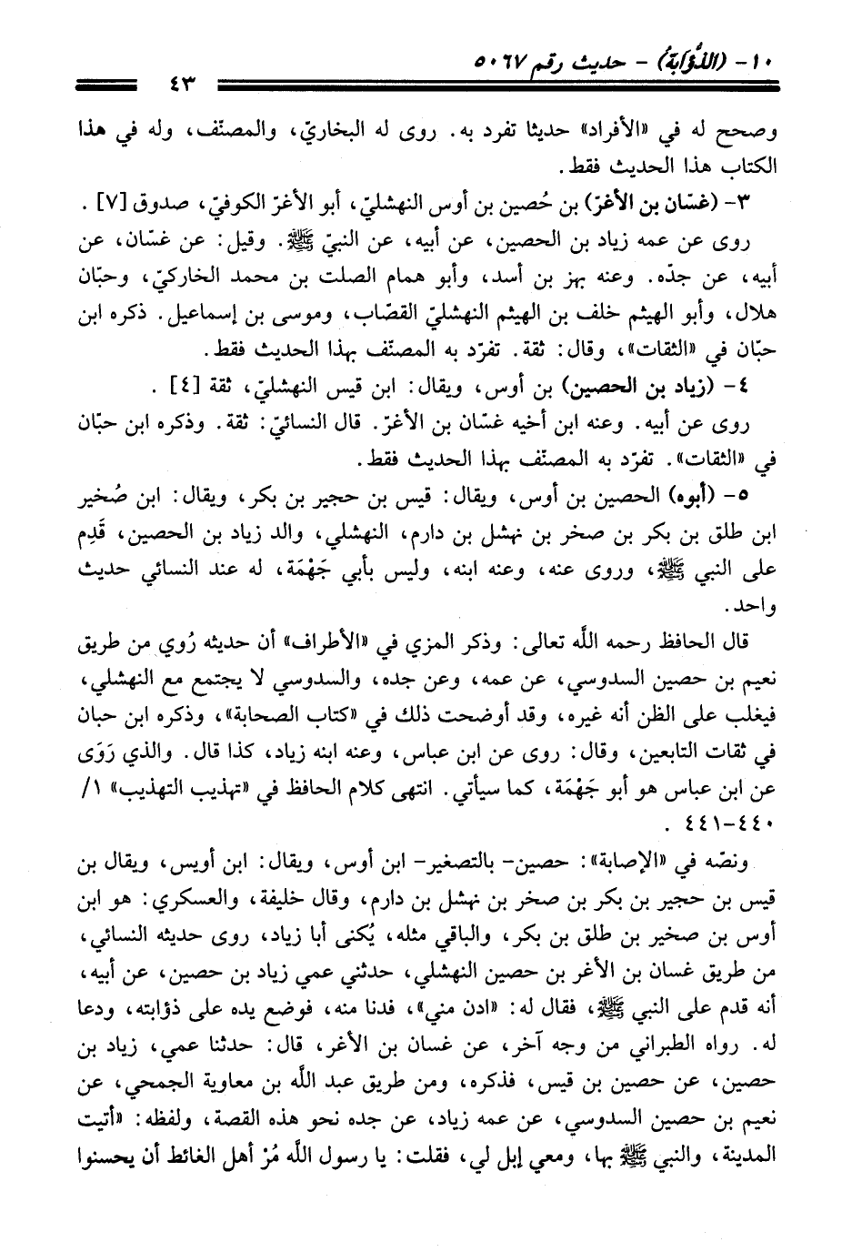 ونصّه فِي "الإصابة". حصين -بالتصغير- ابن أوس، ويقال: ابن أويس، ويقال بن قيس بن حجير بن بكر بن صخر بن نهشل بن دارم، وَقَالَ خليفة، والعسكري: هو ابن أوس بن صخير بن طلق بن بكر، والباقي مثله، يُكنى أبا زياد، روى حديثه النسائيّ، منْ طريق غسان بن الأغر بن حصين النهشلي، حدثني عمي زياد بن حصين، عن أبيه، أنه قدم عَلَى النبيّ -صلى الله عليه وسلم-، فَقَالَ له: "ادن مني"، فدنا منه، فوضع يده عَلَى ذؤابته، ودعا له. رواه الطبراني منْ وجه آخر، عن غسان بن الأغر، قَالَ: حدثنا عمي، زياد بن حصين، عن حصين بن قيس، فذكره، ومن طريق عبد الله بن معاوية الجمحي، عن نعيم بن حصين السدوسي، عن عمه زياد، عن جده نحو هذه القصة، ولفظه: "أتيت المدينة، والنبي -صلى الله عليه وسلم- بها، ومعي إبل لي، فقلت: يا رسول الله مُرْ أهل الغائط أن يحسنوا