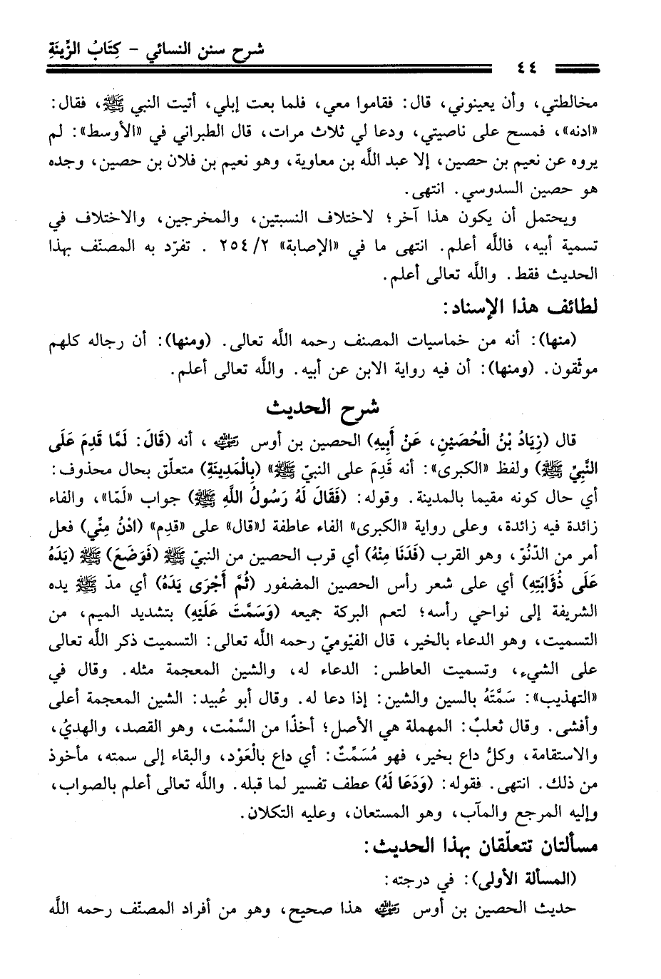 قَالَ (زِيَادُ بْنُ الْحُصَيْنِ، عَنْ أَبِيهِ) الحصين بن أوس -رضي الله عنه-، أنه (قَالَ: لَمَّا قَدِمَ عَلَي النَّبِيِّ -صلى الله عليه وسلم-) ولفظ "الكبرى": أنه قَدِمَ عَلَى النبيّ -صلى الله عليه وسلم-" (بِالْمَدِينَةِ) متعلّق بحال محذوف: أي حال كونه مقيما بالمدينة. وقوله: (فَقَالَ لَهُ رَسُولُ اللهِ -صلى الله عليه وسلم-) جواب "لَمّا"، والفاء زائدة فيه زائدة، وعلى رواية "الكبرى" الفاء عاطفة لـ"قَالَ" عَلَى "قدِم" (ادْنُ مِنِّي) فعل أمر منْ الدّنُوّ، وهو القرب (فَدَنَا مِنْهُ) أي قرب الحصين منْ النبيّ -صلى الله عليه وسلم- (فَوَضَعَ) -صلى الله عليه وسلم- (يَدَهُ عَلَى ذُؤَابَتِهِ) أي عَلَى شعر رأس الحصين المضفور (ثُمَّ أجْرَى يَدَهُ) أي مدّ -صلى الله عليه وسلم- يده الشريفة إلى نواحي رأسه؛ لتعم البركة جميعه (وَسَمَّتَ عَلَيْهِ) بتشديد الميم، منْ التسميت، وهو الدعاء بالخير، قَالَ الفيّوميّ رحمه الله تعالى: التسميت ذكر الله تعالى عَلَى الشيء، وتسميت العاطس: الدعاء له، والشين المعجمة مثله. وَقَالَ فِي "التهذيب": سمّتهُ بالسين والشين: إذا دعا له. وَقَالَ أبو عُبيد: الشين المعجمة أعلى وأفشى. وَقَالَ ثعلبٌ: المهملة هي الأصل؛ أخذاً منْ السَّمْت، وهو القصد، والهديُ، والاستقامة، وكلُّ داع بخير، فهو مُسَمِّتٌ: أي داع بالْعَوْد، والبقاء إلى سمته، مأخوذ منْ ذلك. انتهى. فقوله: (وَدَعَا لَهُ) عطف تفسير لما قبله. والله تعالى أعلم بالصواب، وإليه المرجع والمآب، وهو المستعان، وعليه التكلان.