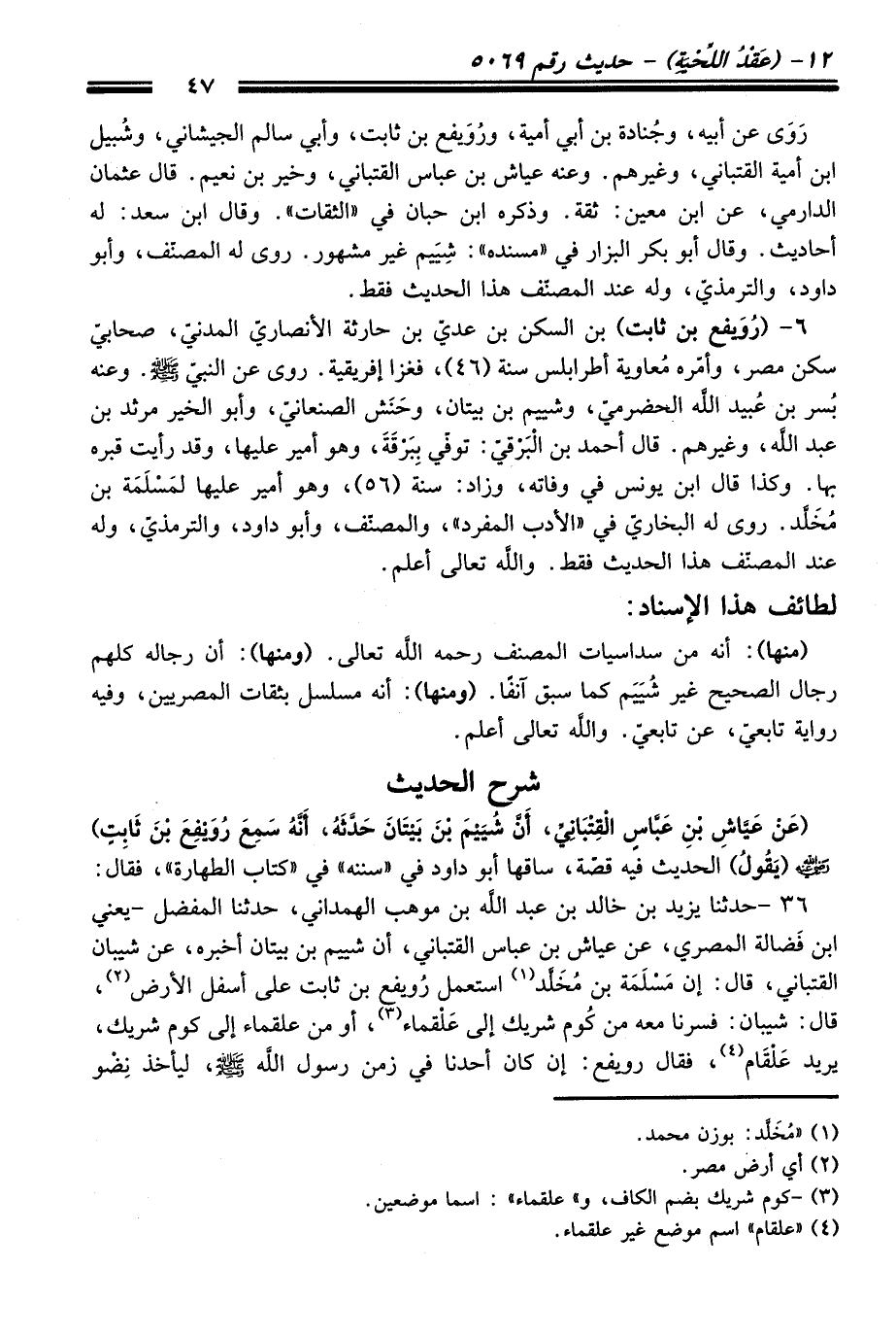 (عَنْ عَيَّاشِ بْنِ عَبَّاسٍ الْقِتْبَانِيِّ، أَنَّ شُيَيْمَ بْنَ بَيْتَانَ حَدَّثَهُ، أَنَّهُ سَمِعَ رُوَيْفِعَ بْنَ ثَابِتٍ) -رضي الله عنه- (يَقُولُ) الْحَدِيث فيه قصة، ساقها أبو داود فِي "سننه" فِي "كتاب الطهارة"، فَقَالَ: