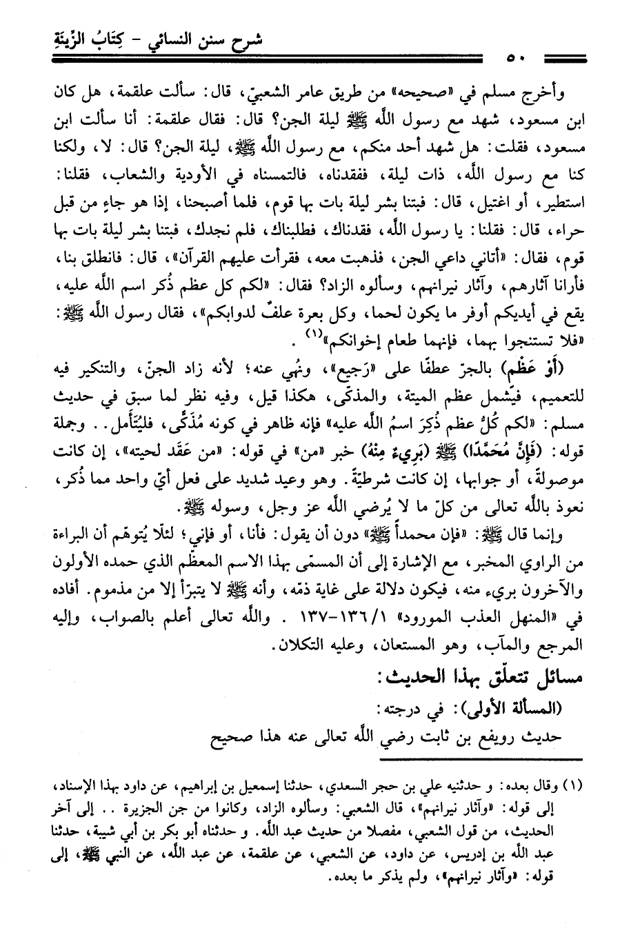 وأخرج مسلم فِي "صحيحه" منْ طريق عامر الشعبيّ، قَالَ: سألت علقمة، هل كَانَ ابن مسعود، شهد مع رسول الله -صلى الله عليه وسلم- ليلة الجن؟ قَالَ: فَقَالَ علقمة: أنا سألت ابن مسعود، فقلت: هل شهد أحد منكم، مع رسول الله -صلى الله عليه وسلم-، ليلة الجن؟ قَالَ: لا، ولكنا كنا مع رسول الله -صلى الله عليه وسلم-، ذات ليلة، ففقدناه، فالتمسناه فِي الأودية والشعاب، فقلنا: استطير، أو اغتيل، قَالَ: فبتنا بشر ليلة بات بها قوم، فلما أصبحنا، إذا هو جاءٍ منْ قبل حراء، قَالَ: فقلنا: يا رسول الله -صلى الله عليه وسلم-، فقدناك، فطلبناك، فلم نجدك، فبتنا بشر ليلة بات بها قوم، فَقَالَ: "أتاني داعي الجن، فذهبت معه، فقرأت عليهم القرآن"، قَالَ: فانطلق بنا، فأرانا آثارهم، وآثار نيرانهم، وسألوه الزاد؟ فَقَالَ: "لكم كل عظم ذُكر اسم الله عليه، يقع فِي أيديكم أوفر ما يكون لحما، وكل بعرة علفٌ لدوابكم"، فَقَالَ رسول الله -صلى الله عليه وسلم-: "فلا تستنجوا بهما، فإنهما طعام إخوانكم" (¬1).