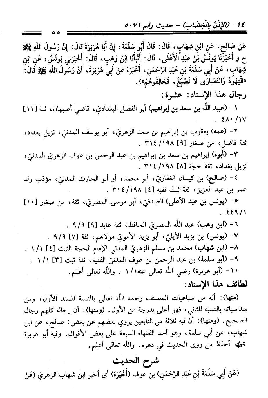 عَنْ صَالِحٍ، عَنِ ابْنِ شِهَابٍ، قَالَ: قَالَ أَبُو سَلَمَةَ، إِنَّ أَبَا هُرَيْرَةَ قَالَ: إِنَّ رَسُولَ اللَّهِ -صلى الله عليه وسلم- ح وَأَخْبَرَنَا يُونُسُ بْنُ عَبْدِ الأَعْلَى، قَالَ: أَنْبَأَنَا ابْنُ وَهْبٍ، قَالَ: أَخْبَرَنِي يُونُسُ، عَنِ ابْنِ شِهَابٍ، عَنْ أَبِي سَلَمَةَ بْنِ عَبْدِ الرَّحْمَنِ، أَخْبَرَهُ عَنْ أَبِي هُرَيْرَةَ، أَنَّ رَسُولَ اللَّهِ -صلى الله عليه وسلم- قَالَ: "الْيَهُودُ وَالنَّصَارَى لاَ تَصْبُغُ، فَخَالِفُوهُمْ").