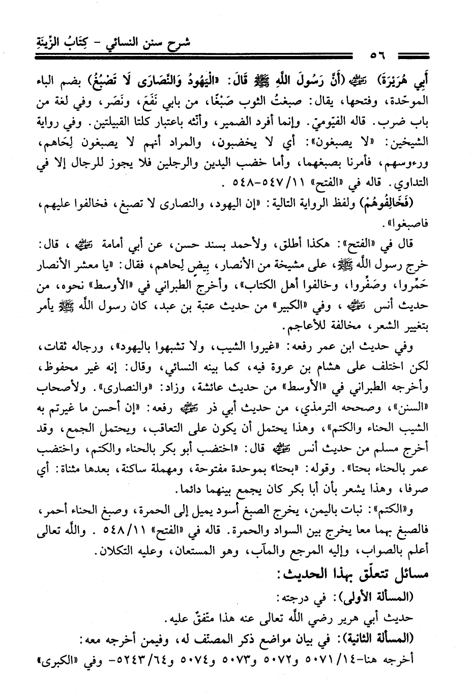 قَالَ فِي "الفتح": هكذا أطلق، ولأحمد بسند حسن، عن أبي أمامة -رضي الله عنه-، قَالَ: خرج رسول الله -صلى الله عليه وسلم-، عَلَى مشيخة منْ الأنصار، بِيضٍ لِحاهم، فَقَالَ: "يا معشر الأنصار حَمِّروا، وصَفِّروا، وخالفوا أهل الكتاب"، وأخرج الطبراني فِي "الأوسط" نحوه، منْ حديث أنس -رضي الله عنه-، وفي "الكبير" منْ حديث عتبة بن عبد، كَانَ رسول الله -صلى الله عليه وسلم- يأمر بتغيير الشعر، مخالفة للأعاجم.
