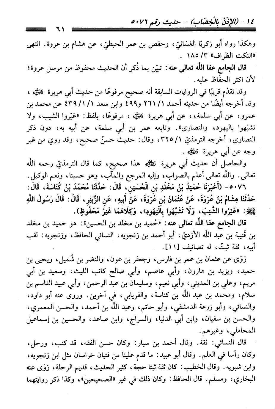 5076 - (أَخْبَرَنَا حُمَيْدُ بْنُ مَخْلَدِ بْنِ الْحُسَيْنِ، قَالَ: حَدَّثَنَا مُحَمَّدُ بْنُ كُنَاسَةَ، قَالَ: حَدَّثَنَا هِشَامُ بْنُ عُرْوَةَ، عَنْ عُثْمَانَ بْنِ عُرْوَةَ، عَنْ أَبِيهِ، عَنِ الزُّبَيْرِ، قَالَ: قَالَ رَسُولُ اللَّهِ -صلى الله عليه وسلم-: "غَيِّرُوا الشَّيْبَ، وَلاَ تَشَبَّهُوا بِالْيَهُودِ". وَكِلاَهُمَا غَيْرُ مَحْفُوظٍ).