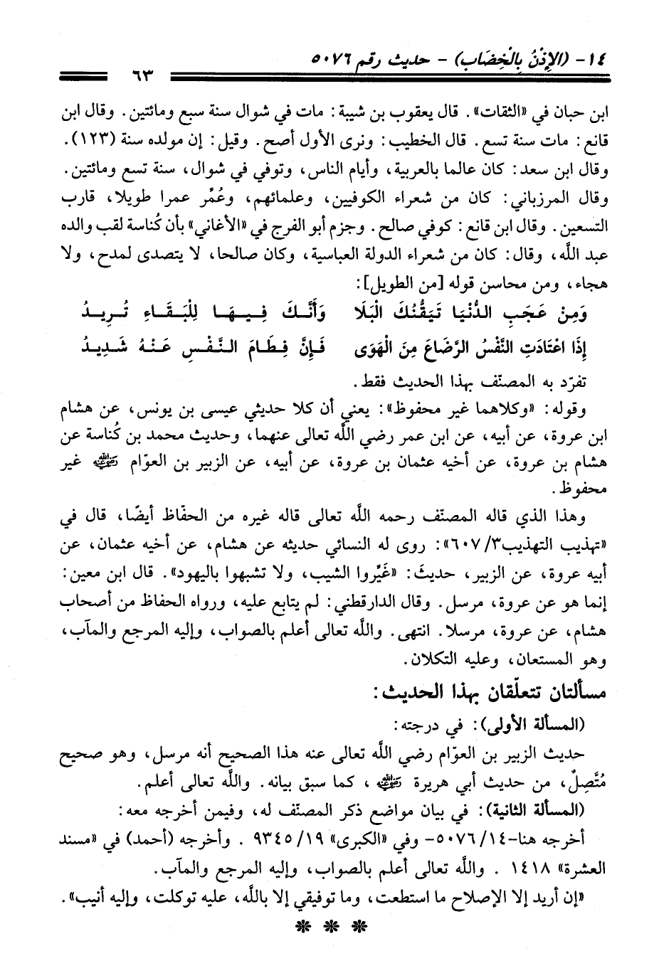 وهذا الذي قاله المصنّف رحمه الله تعالى قاله غيره منْ الحفّاظ أيضًا، قَالَ فِي "تهذيب التهذيب 3/ 607": روى له النسائيّ حديثه عن هشام، عن أخيه عثمان، عن أبيه عروة، عن الزبير، حديثَ: "غَيِّروا الشيب، ولا تشبهوا باليهود". قَالَ ابن معين: إنما هو عن عروة، مرسل. وَقَالَ الدارقطنيّ: لم يتابع عليه، ورواه الحفاظ منْ أصحاب هشام، عن عروة، مرسلا. انتهى. والله تعالى أعلم بالصواب، وإليه المرجع والمآب، وهو المستعان، وعليه التكلان.