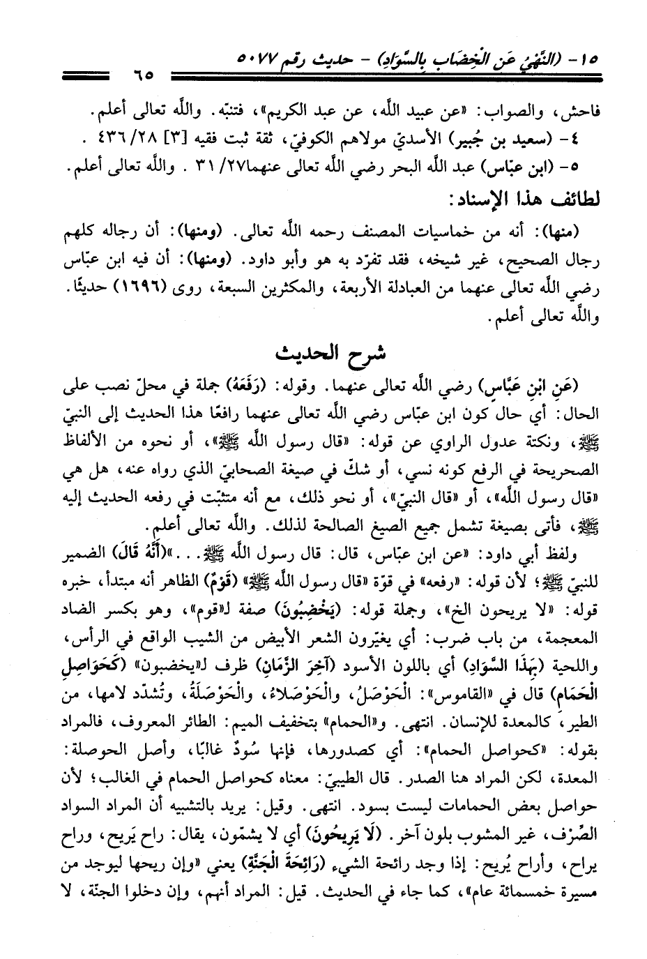 ولفظ أبي داود: "عن ابن عبّاس، قَالَ: قَالَ رسول الله -صلى الله عليه وسلم- ... " (أَنَّهُ قَالَ) الضمير للنبيّ -صلى الله عليه وسلم-؛ لأن قوله: "رفعه" فِي قوّة "قَالَ رسول الله -صلى الله عليه وسلم-" (قَوْمٌ) الظاهر أنه مبتدأ، خبره قوله: "لا يريحون الخ"، وجملة قوله: (يَخْضِبُون) صفة لـ"قوم"، وهو بكسر الضاد المعجمة، منْ باب ضرب: أي يغيّرون الشعر الأبيض منْ الشيب الواقع فِي الرأس، واللحية (بِهَذَا السَّوَادِ) أي باللون الأسود (آخِرَ الزَّمَانِ) ظرف لـ"يخضبون" (كَحَوَاصِلِ الْحَمَامِ) قَالَ فِي "القاموس": الْحَوْصَلُ، والْحَوْصَلاءُ، والْحَوْصَلَةُ، وتُشدّد لامها، منْ الطير، كالمعدة للإنسان. انتهى. و"الحمام" بتخفيف الميم: الطائر المعروف، فالمراد بقوله: "كحواصل الحمام": أي كصدورها، فإنها سُودٌ غالبًا، وأصل الحوصلة: المعدة، لكن المراد هنا الصدر. قَالَ الطيبيّ: معناه كحواصل الحمام فِي الغالب؛ لأن حواصل بعض الحمامات ليست بسود. انتهى. وقيل: يريد بالتشبيه أن المراد السواد الصِّرْف، غير المشوب بلون آخر. (لا يَرِيحُونَ) أي لا يشمّون، يقال: راح يَريح، وراح يراح، وأراح يُريح: إذا وجد رائحة الشيء (رَائِحَةَ الْجَنَّةِ) يعني "وإن ريحها ليوجد منْ مسيرة خمسمائة عام"، كما جاء فِي الْحَدِيث. قيل: المراد أنهم، وإن دخلوا الجنّة، لا