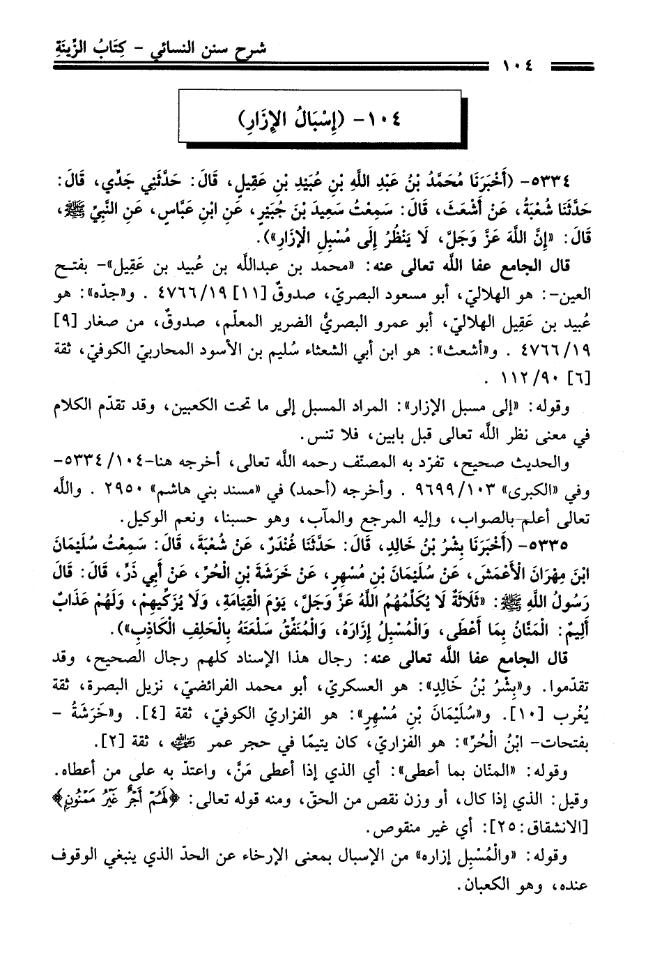 5334 - (أَخْبَرَنَا مُحَمَّدُ بْنُ عَبْدِ اللَّهِ بْنِ عُبَيْدِ بْنِ عَقِيلٍ، قَالَ: حَدَّثَنِي جَدِّي، قَالَ: حَدَّثَنَا شُعْبَةُ، عَنْ أَشْعَثَ، قَالَ: سَمِعْتُ سَعِيدَ بْنَ جُبَيْرٍ، عَنِ ابْنِ عَبَّاسٍ، عَنِ النَّبِيِّ -صلى الله عليه وسلم-، قَالَ: "إِنَّ اللَّهَ عَزَّ وَجَلَّ، لاَ يَنْظُرُ إِلَى مُسْبِلِ الإِزَارِ").