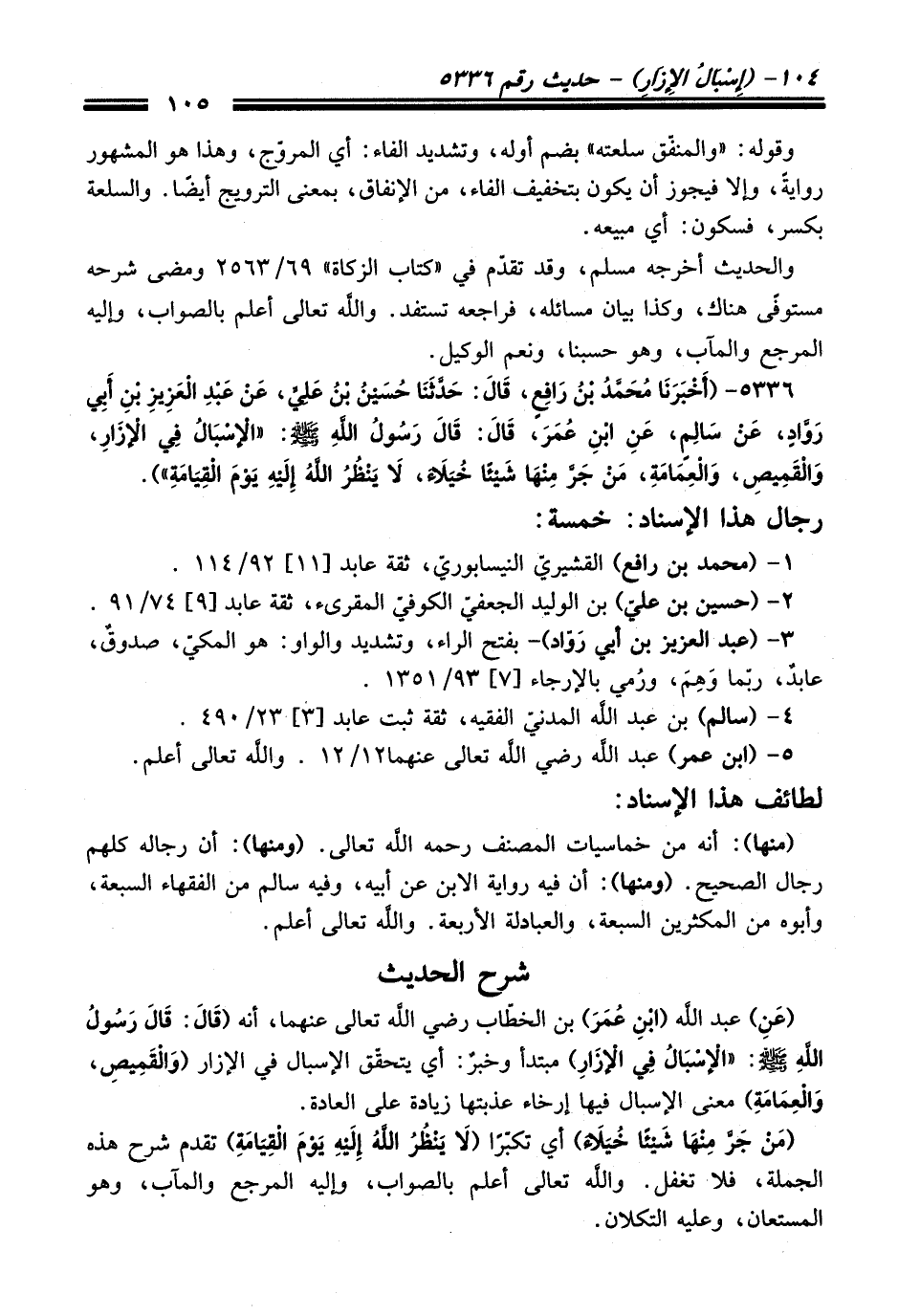 5336 - (أَخْبَرَنَا مُحَمَّدُ بْنُ رَافِعٍ، قَالَ: حَدَّثَنَا حُسَيْنُ بْنُ عَلِيٍّ، عَنْ عَبْدِ الْعَزِيزِ بْنِ أَبِي رَوَّادٍ، عَنْ سَالِمٍ، عَنِ ابْنِ عُمَرَ، قَالَ: قَالَ رَسُولُ اللَّهِ -صلى الله عليه وسلم-: "الإِسْبَالُ فِي الإِزَارِ، وَالْقَمِيصِ، وَالْعِمَامَةِ، مَنْ جَرَّ مِنْهَا شَيْئًا خُيَلاَءَ، لاَ يَنْظُرُ اللَّهُ إِلَيْهِ يَوْمَ الْقِيَامَةِ").