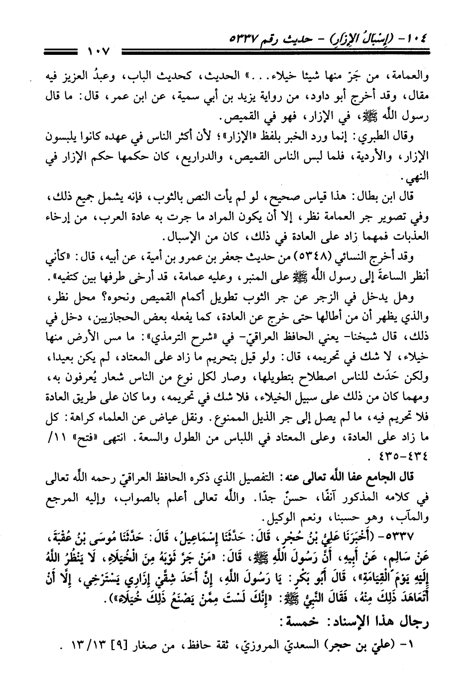 5337 - (أَخْبَرَنَا عَلِيُّ بْنُ حُجْرٍ، قَالَ: حَدَّثَنَا إِسْمَاعِيلُ، قَالَ: حَدَّثَنَا مُوسَى بْنُ عُقْبَةَ، عَنْ سَالِمٍ، عَنْ أَبِيهِ، أَنَّ رَسُولَ اللَّهِ -صلى الله عليه وسلم-، قَالَ: "مَنْ جَرَّ ثَوْبَهُ مِنَ الْخُيَلاَءِ، لاَ يَنْظُرُ اللَّهُ إِلَيْهِ يَوْمَ الْقِيَامَةِ"، قَالَ أَبُو بَكْرٍ: يَا رَسُولَ اللَّهِ، إِنَّ أَحَدَ شِقَّيْ إِزَارِى يَسْتَرْخِي، إِلاَّ أَنْ أَتَعَاهَدَ ذَلِكَ مِنْهُ، فَقَالَ النَّبِيُّ -صلى الله عليه وسلم-: "إِنَّكَ لَسْتَ مِمَّنْ يَصْنَعُ ذَلِكَ خُيَلاَءَ").