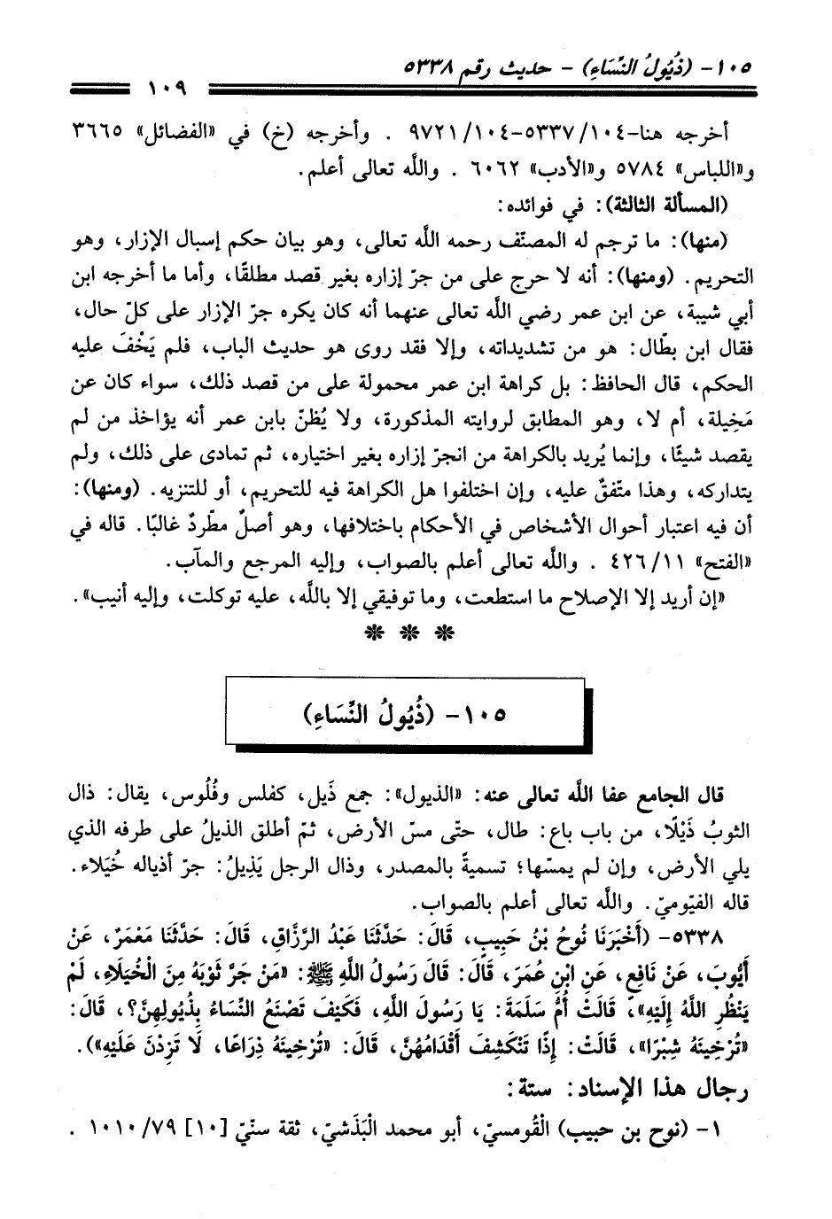 5338 - (أَخْبَرَنَا نُوحُ بْنُ حَبِيبٍ، قَالَ: حَدَّثَنَا عَبْدُ الرَّزَّاقِ، قَالَ: حَدَّثَنَا مَعْمَرٌ، عَنْ أَيُّوبَ، عَنْ نَافِعٍ، عَنِ ابْنِ عُمَرَ، قَالَ: قَالَ رَسُولُ اللَّهِ -صلى الله عليه وسلم-: "مَنْ جَرَّ ثَوْبَهُ مِنَ الْخُيَلاَءِ، لَمْ يَنْظُرِ اللَّهُ إِلَيْهِ"، قَالَتْ أُمُّ سَلَمَةَ: يَا رَسُولَ اللَّهِ، فَكَيْفَ تَصْنَعُ النِّسَاءُ بِذُيُولِهِنَّ؟، قَالَ: "تُرْخِينَهُ شِبْرًا"، قَالَتْ: إِذًا تَنْكَشِفَ أَقْدَامُهُنَّ، قَالَ: "تُرْخِينَهُ ذِرَاعًا، لاَ تَزِدْنَ عَلَيْهِ").