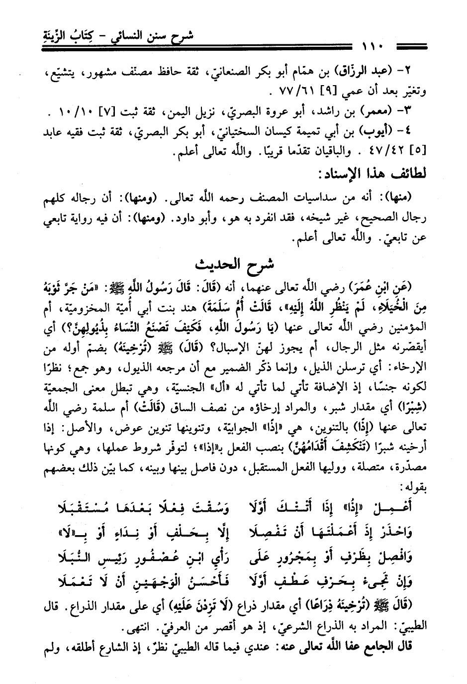 (عَنِ ابْنِ عُمَرَ) رضي الله تعالى عنهما، أنه (قَالَ: قَالَ رَسُولُ اللَّهِ -صلى الله عليه وسلم-: "مَنْ جَرَّ ثَوْبَهُ مِنَ الْخُيَلاَءِ، لَمْ يَنْظُرِ اللَّهُ إِلَيْهِ"، قَالَتْ أُمُّ سَلَمَةَ) هند بنت أبي أُميّة المخزوميّة، أم المؤمنين رضي الله تعالى عنها (يَا رَسُولَ اللَّهِ، فَكَيْفَ تَصْنَعُ النِّسَاءُ بِذُيُولِهِنَّ؟) أي أيقصّرنه مثل الرجال، أم يجوز لهن الإسبال؟ (قَالَ) -صلى الله عليه وسلم- (تُرْخِينَهُ) بضم أوله منْ الإرخاء: أي ترسلن الذيل، وإنما ذكّر الضمير مع أن مرجعه الذيول، وهو جمع؛ نظراً لكونه جنسًا، إذ الإضافة تأتي لما تأتي له "أل" الجنسية، وهي تبطل معنى الجمعيّة (شِبْراً) أي مقدار شبر، والمراد إرخاؤه منْ نصف الساق (قَالَتْ) أم سلمة رضي الله تعالى عنها (إِذاً) بالتنوين، هي "إذًا" الجوابية، وتنوينها تنوين عوض، والأصل: إذا أرخينه شبراً (تَنْكَشِفَ أَقْدَامُهُنَّ) بنصب الفعل بـ"إذا"؛ لتوفّر شروط عملها، وهي كونها مصدّرة، متصلة، ووليها الفعل المستقبل، دون فاصل بينها وبينه، كما بيّن ذلك بعضهم بقوله: