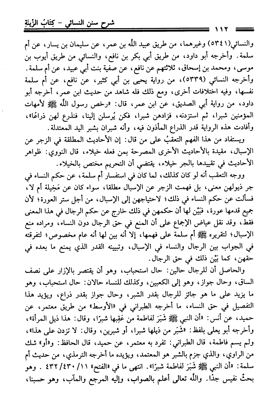 والحاصل أن للرجال حالين: حال استحياب، وهو أن يقتصر بالإزار عَلَى نصف الساق، وحال جواز، وهو إلى الكعبين، وكذلك للنساء حالان: حال استحباب، وهو ما يزيد عَلَى ما هو جائز للرجال بقدر الشبر، وحال جواز بقدر ذراع، ويؤيد هَذَا التفصيل فِي حق النِّساء، ما أخرجه الطبراني فِي "الأوسط" منْ طريق معتمر، عن حميد، عن أنس: "أن النبيّ -صلى الله عليه وسلم- شَبَرَ لفاطمة منْ عَقِبها شبرًا، وَقَالَ: هَذَا ذيل المرأة"، وأخرجه أبو يعلى بلفظ: "شَبَر منْ ذيلها شبرا، أو شبرين، وَقَالَ: لا تزدن عَلَى هَذَا"، ولم يسم فاطمة، قَالَ الطبراني: تفرد به معتمر، عن حميد، قَالَ الحافظ: و"أو" شك منْ الراوي، والذي جزم بالشبر هو المعتمد، ويؤيده ما أخرجه الترمذيّ، منْ حديث أم سلمة: "أن النبيّ -صلى الله عليه وسلم- شَبَرَ لفاطمة شبرًا". انتهى ما فِي "الفتح" 11/ 430/ 432. وهو بحثٌ نفيس جدًّا. والله تعالى أعلم بالصواب، وإليه المرجع والمآب، وهو حسبنا،