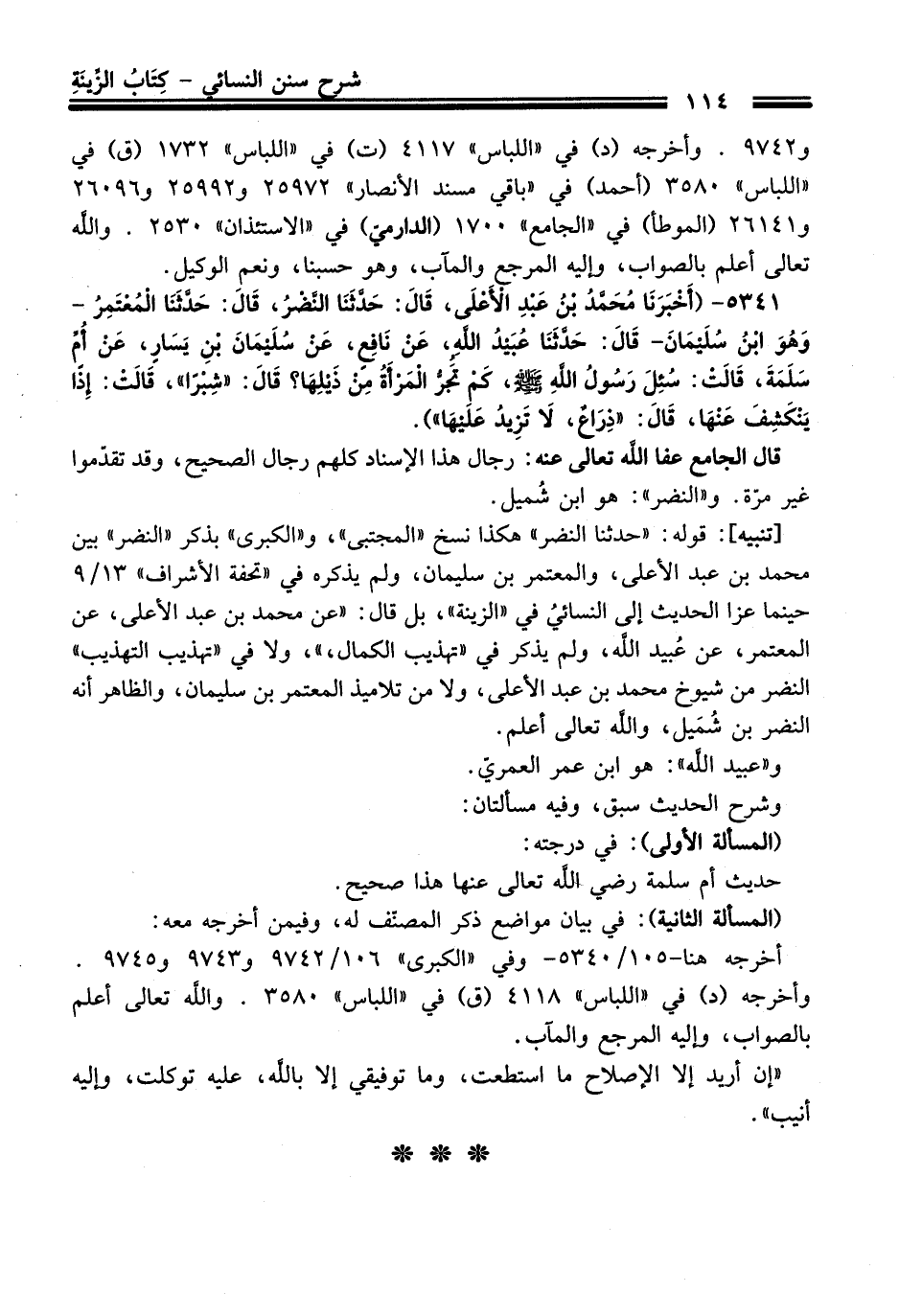 [تنبيه]: قوله: "حدثنا النضر" هكذا نسخ "المجتبى"، و"الكبرى" بذكر "النضر" بين محمد بن عبد الأعلى، والمعتمر بن سليمان، ولم يذكره فِي "تحفة الأشراف" 13/ 9 حينما عزا الْحَدِيث إلى النسائيِّ فِي "الزينة"، بل قَالَ: "عن محمد بن عبد الأعلى، عن المعتمر، عن عُبيد الله، ولم يذكر فِي "تهذيب الكمال"، ولا فِي "تهذيب التهذيب" النضر منْ شيوخ محمد بن عبد الأعلى، ولا منْ تلاميذ المعتمر بن سليمان، والظاهر أنه النضر بن شُمَيل، والله تعالى أعلم.