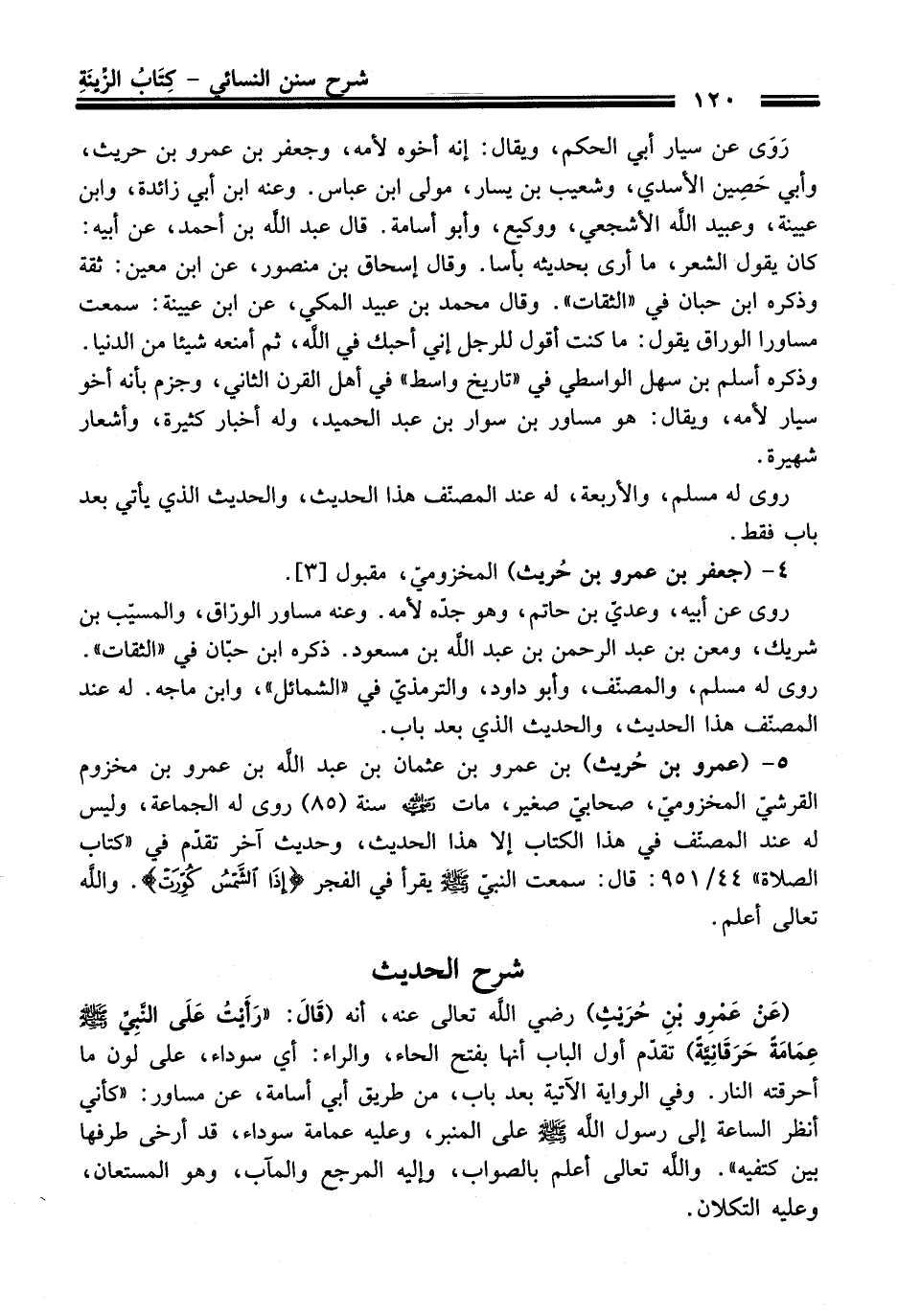 (عَنْ عَمْرِو بْنِ حُرَيْثٍ) رضي الله تعالى عنه، أنه (قَالَ: "رَأَيْتُ عَلَى النَّبِيِّ -صلى الله عليه وسلم- عِمَامَةً حَرْقَانِيَّةً) تقدّم أول الباب أنها بفتح الحاء، والراء: أي سوداء، عَلَى لون ما أحرقته النار. وفي الرواية الآتية بعد باب، منْ طريق أبي أسامة، عن مساور: "كأني أنظر الساعة إلى رسول الله -صلى الله عليه وسلم- عَلَى المنبر، وعليه عمامة سوداء، قد أرخى طرفها بين كتفيه". والله تعالى أعلم بالصواب، وإليه المرجع والمآب، وهو المستعان، وعليه التكلان.