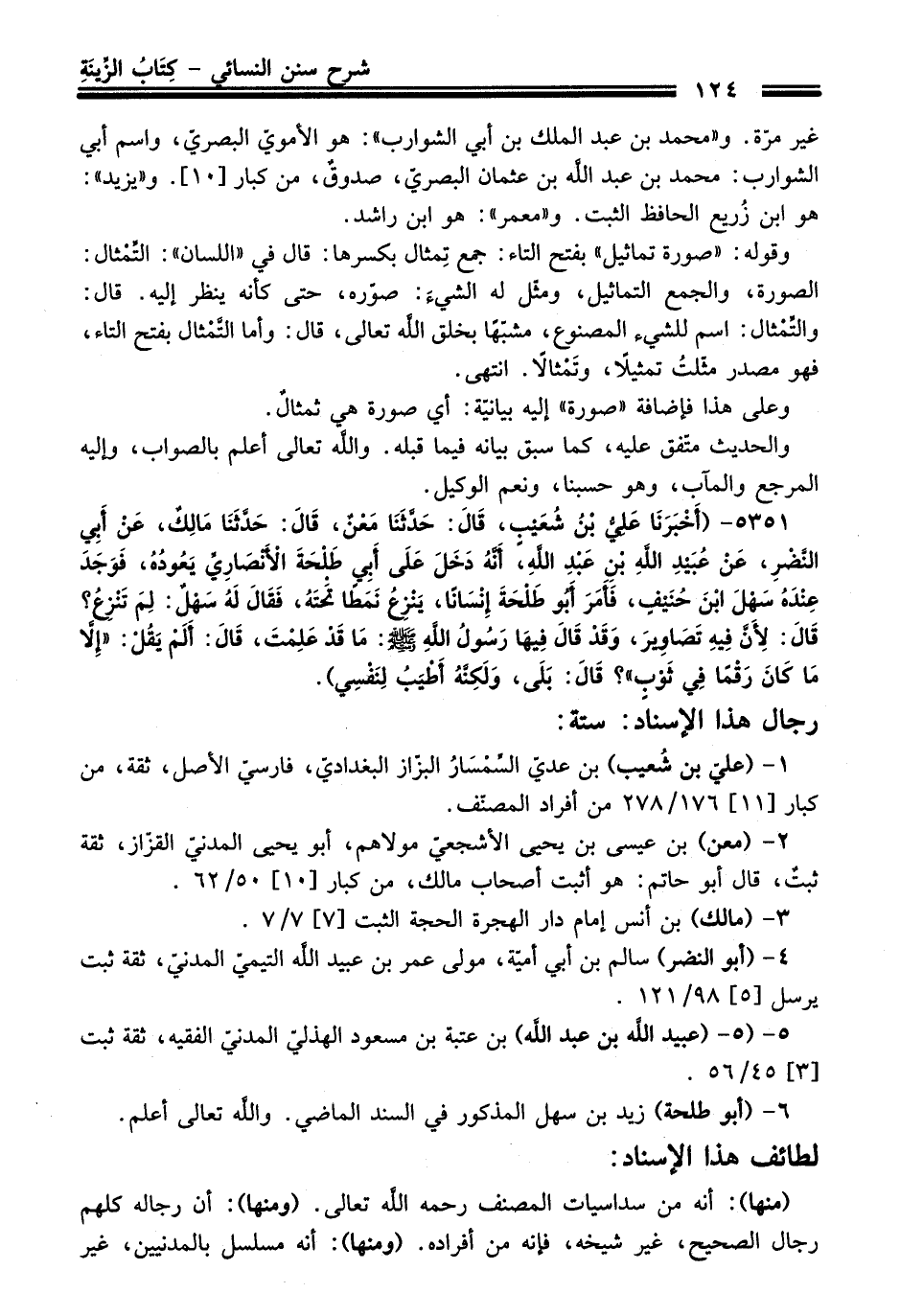 5351 - (أَخْبَرَنَا عَلِيُّ بْنُ شُعَيْبٍ، قَالَ: حَدَّثَنَا مَعْنٌ، قَالَ: حَدَّثَنَا مَالِكٌ، عَنْ أَبِي النَّضْرِ، عَنْ عُبَيْدِ اللَّهِ بْنِ عَبْدِ اللَّهِ، أَنَّهُ دَخَلَ عَلَى أَبِي طَلْحَةَ الأَنْصَارِيِّ يَعُودُهُ، فَوَجَدَ عِنْدَهُ سَهْلَ بْنَ حُنَيْفٍ، فَأَمَرَ أَبُو طَلْحَةَ إِنْسَانًا، يَنْزِعُ نَمَطًا تَحْتَهُ، فَقَالَ لَهُ سَهْلٌ: لِمَ تَنْزِعُ؟ قَالَ: لأَنَّ فِيهِ تَصَاوِيرُ، وَقَدْ قَالَ فِيهَا رَسُولُ اللَّهِ -صلى الله عليه وسلم-: مَا قَدْ عَلِمْتَ، قَالَ: أَلَمْ يَقُلْ: "إِلاَّ مَا كَانَ رَقْمًا فِي ثَوْبٍ"؟ قَالَ: بَلَى، وَلَكِنَّهُ أَطْيَبُ لِنَفْسِي).