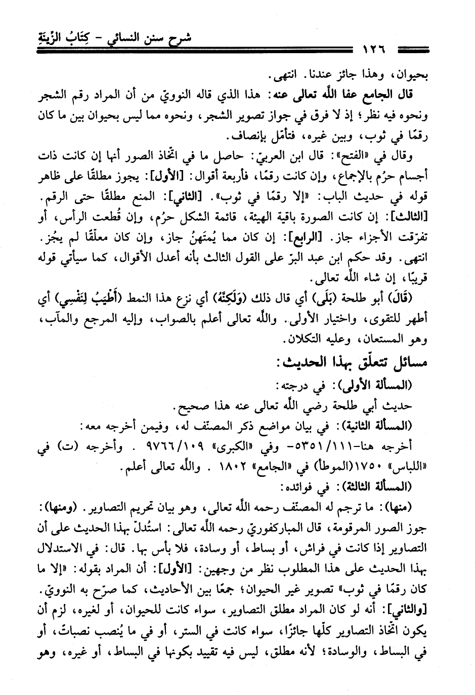 وَقَالَ فِي "الفتح": قَالَ ابن العربيّ: حاصل ما فِي اتّخاذ الصور أنها إن كانت ذات أجسام حرُم بالإجماع، وإن كانت رقما، فأربعة أقوال: [الأول]: يجوز مطلقًا عَلَى ظاهر قوله فِي حديث الباب: "إلا رقمًا فِي ثوب". [الثاني]: المنع مطلقًا حَتَّى الرقم. [الثالث]: إن كانت الصورة باقية الهيئة، قائمة الشكل حرُم، وإن قُطعت الرأس، أو تفرّقت الأجزاء جاز. [الرابع]: إن كَانَ مما يُمتَهنُ جاز، وإن كَانَ معلّقًا لم يجُز. انتهى. وَقَدْ حكم ابن عبد البرّ عَلَى القول الثالث بأنه أعدل الأقوال، كما سيأتي قوله قريباً، إن شاء الله تعالى.