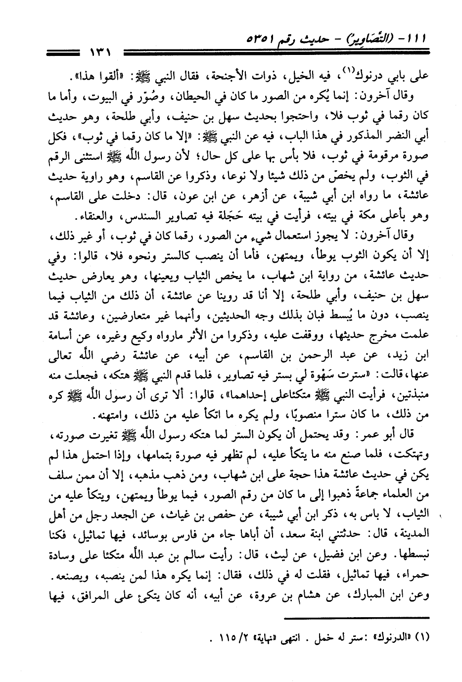 وَقَالَ آخرون: لا يجوز استعمال شيء منْ الصور، رقما كَانَ فِي ثوب، أو غير ذلك، إلا أن يكون الثوب يوطأ، ويمتهن، فأما أن ينصب كالستر ونحوه فلا، قالوا: وفي حديث عائشة، منْ رواية ابن شهاب، ما يخص الثياب ويعينها، وهو يعارض حديث سهل بن حنيف، وأبي طلحة، إلا أنا قد روينا عن عائشة، أن ذلك منْ الثياب فيما ينصب، دون ما يُبسط فبان بذلك وجه الحديثين، وأنهما غير متعارضين، وعائشة قد علمت مخرج حديثها، ووقفت عليه، وذكروا منْ الأثر ما رواه وكيع وغيره، عن أسامة ابن زيد، عن عبد الرحمن بن القاسم، عن أبيه، عن عائشة رضي الله تعالى عنها، قالت: "سترت سَهْوة لي بستر فيه تصاوير، فلما قدم النبيّ -صلى الله عليه وسلم- هتكه، فجعلت منه منبذتين، فرأيت النبيّ -صلى الله عليه وسلم- متكئا عَلَى إحداهما"، قالوا: ألا ترى أن رسول الله -صلى الله عليه وسلم- كره منْ ذلك، ما كَانَ سترا منصوبًا، ولم يكره ما اتكأ عليه منْ ذلك، وامتهنه.