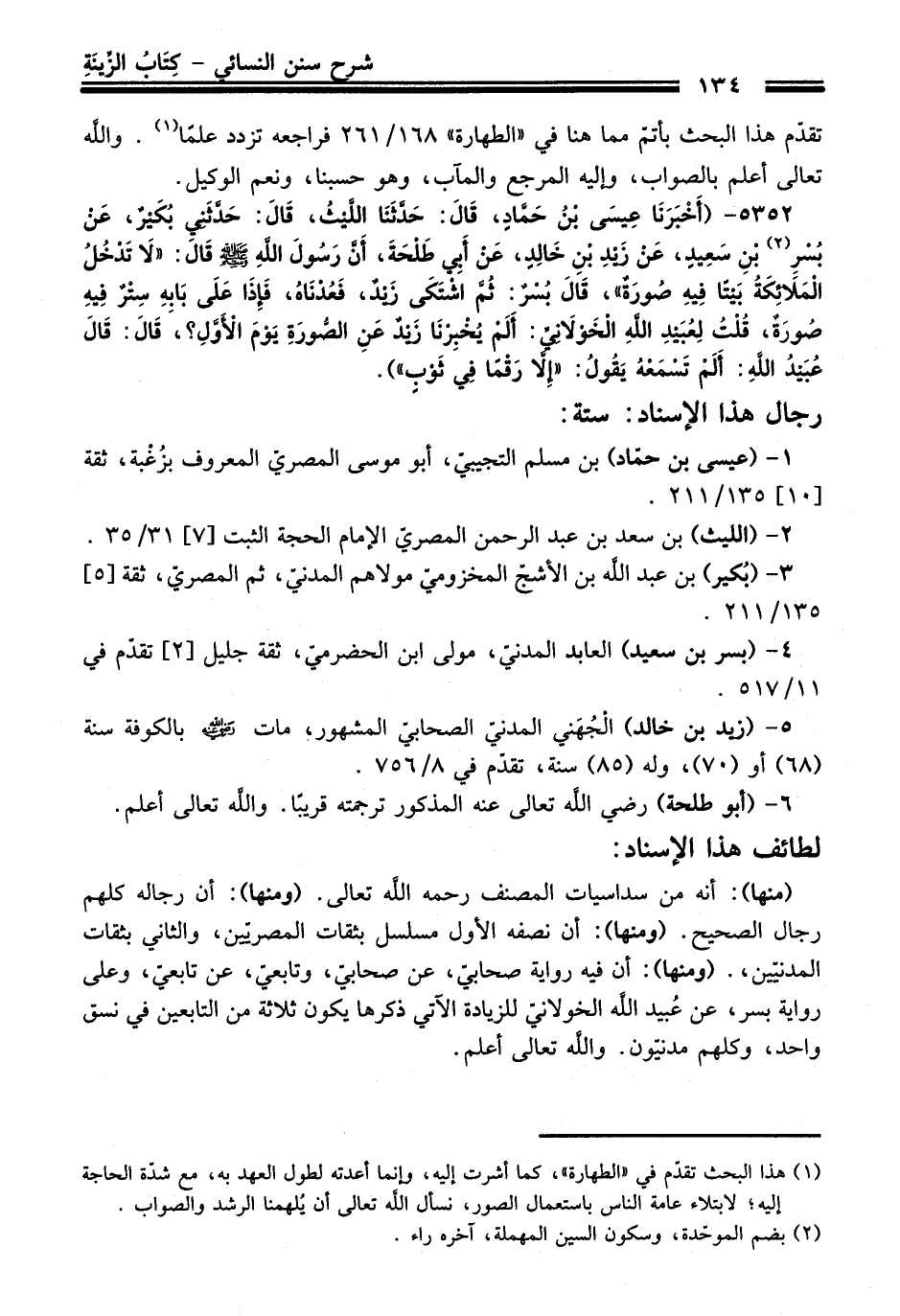 5352 - (أَخْبَرَنَا عِيسَى بْنُ حَمَّادٍ، قَالَ: حَدَّثَنَا اللَّيْثُ، قَالَ: حَدَّثَنِي بُكَيْرٌ، عَنْ بُسْرِ (¬2) بْنِ سَعِيدٍ، عَنْ زَيْدِ بْنِ خَالِدٍ، عَنْ أَبِي طَلْحَةَ، أَنَّ رَسُولَ اللَّهِ -صلى الله عليه وسلم- قَالَ: "لاَ تَدْخُلُ الْمَلاَئِكَةُ بَيْتًا فِيهِ صُورَةٌ"، قَالَ بُسْرٌ: ثُمَّ اشْتَكَى زَيْدٌ، فَعُدْنَاهُ، فَإِذَا عَلَى بَابِهِ سِتْرٌ فِيهِ صُورَةٌ، قُلْتُ لِعُبَيْدِ اللَّهِ الْخَوْلاَنِيِّ: أَلَمْ يُخْبِرْنَا زَيْدٌ عَنِ الصُّورَةِ يَوْمَ الأَوَّلِ؟، قَالَ: قَالَ عُبَيْدُ اللَّهِ: أَلَمْ تَسْمَعْهُ يَقُولُ: "إِلاَّ رَقْمًا فِي ثَوْبٍ").