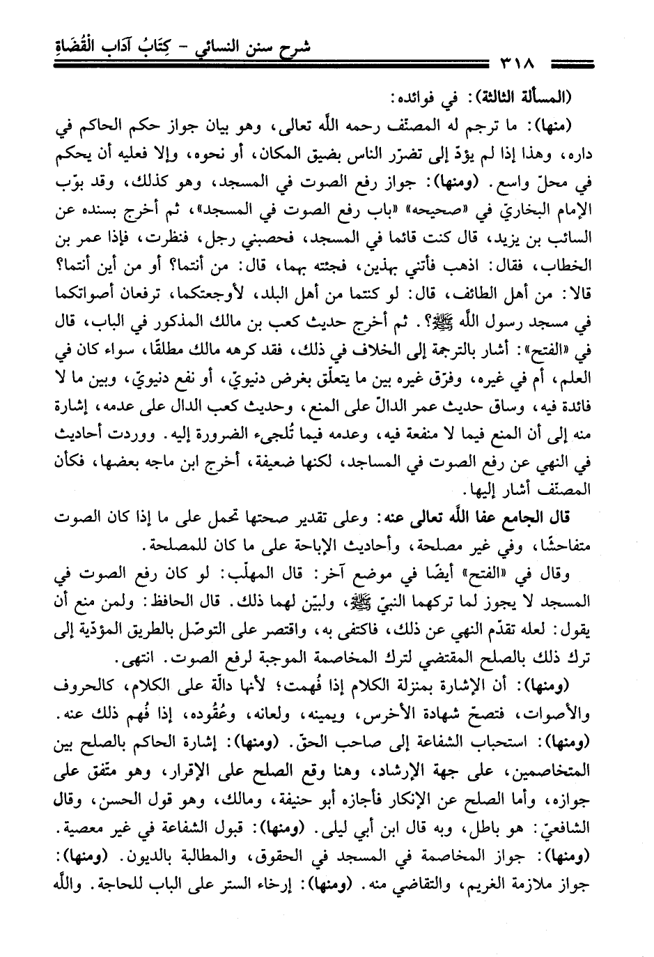 (منها): ما ترجم له المصنّف رحمه الله تعالى، وهو بيان جواز حكم الحاكم فِي داره، وهذا إذا لم يؤدّ إلى تضرّر النَّاس بضيق المكان، أو نحوه، وإلا فعليه أن يحكم فِي محلّ واسع. (ومنها): جواز رفع الصوت فِي المسجد، وهو كذلك، وَقَدْ بوّب الإِمام البخاريّ فِي "صحيحه" "باب رفع الصوت فِي المسجد"، ثم أخرج بسنده عن السائب بن يزيد، قَالَ كنت قائما فِي المسجد، فحصبني رجل، فنظرت، فإذا عمر بن الخطاب، فَقَالَ: اذهب فأتني بهذين، فجئته بهما، قَالَ: منْ أنتما؟ أو منْ أين أنتما؟ قالا: منْ أهل الطائف، قَالَ: لو كنتما منْ أهل البلد، لأوجعتكما، ترفعان أصواتكما فِي مسجد رسول الله -صلى الله عليه وسلم-؟. ثم أخرج حديث كعب بن مالك المذكور فِي الباب، قَالَ فِي "الفتح": أشار بالترجمة إلى الخلاف فِي ذلك، فقد كرهه مالك مطلقًا، سواء كَانَ فِي العلم، أم فِي غيره، وفرّق غيره بين ما يتعلّق بغرض دنيويّ، أو نفع دنيويّ، وبين ما لا فائدة فيه، وساق حديث عمر الدالّ عَلَى المنع، وحديث كعب الدال عَلَى عدمه، إشارة منه إلى أن المنع فيما لا منفعة فيه، وعدمه فيما تُلجىء الضرورة إليه. ووردت أحاديث فِي النهي عن رفع الصوت فِي المساجد، لكنها ضعيفة، أخرج ابن ماجه بعضها، فكأن المصنّف أشار إليها.
