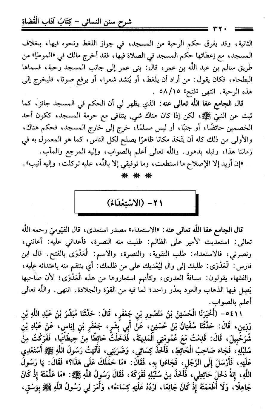 قَالَ الجامع عفا الله تعالى عنه: الذي يظهر لي أن الحكم فِي المسجد جائز، كما ثبت عن النبيّ -صلى الله عليه وسلم-، لكن إذا كَانَ هناك شيء يتنافى مع حرمة المسجد، ككون أحد الخصمين حائضًا، أو جنبًا، أو ليس مسلمًا، خرج إلى خارج المسجد، فحكم هناك، والأولى منْ ذلك كله أن يتّخذ مكانا ظاهرًا يصلح لكل النَّاس، كما هو المعمول به فِي زماننا هَذَا، وقبله بدهور. والله تعالى أعلم بالصواب، وإليه المرجع والمآب.