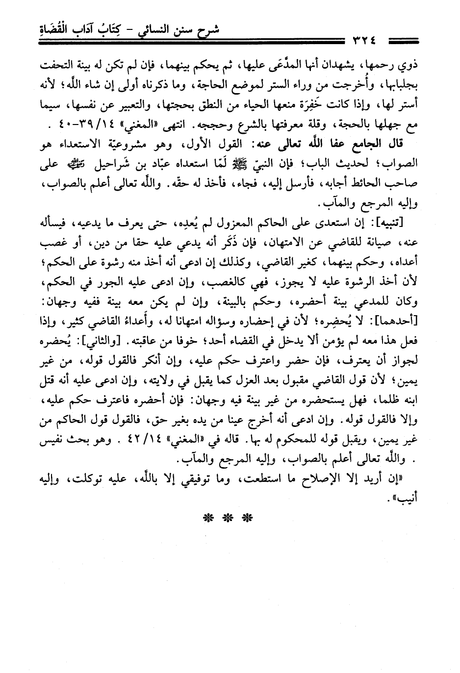 [تنبيه]: إن استعدى عَلَى الحاكم المعزول لم يُعدِه، حَتَّى يعرف ما يدعيه، فيسأله عنه، صيانة للقاضي عن الامتهان، فإن ذَكَر أنه يدعي عليه حقا منْ دين، أو غصب أعداه، وحكم بينهما، كغير القاضي، وكذلك إن ادعى أنه أخذ منه رشوة عَلَى الحكم؛ لأن أخذ الرشوة عليه لا يجوز، فهي كالغصب، وإن ادعى عليه الجور فِي الحكم، وكان للمدعي بينة أحضره، وحكم بالبينة، وإن لم يكن معه بينة ففيه وجهان: [أحدهما]: لا يُحضِره؛ لأن فِي إحضاره وسؤاله امتهانا له، وأَعداءُ القاضي كثير، وإذا فعل هَذَا معه لم يؤمن ألا يدخل فِي القضاء أحد؛ خوفا منْ عاقبته. [والثاني]: يُحضره لجواز أن يعترف، فإن حضر واعترف حكم عليه، وإن أنكر فالقول قوله، منْ غير يمين؛ لأن قول القاضي مقبول بعد العزل كما يقبل فِي ولايته، وإن ادعى عليه أنه قتل ابنه ظلما، فهل يستحضره منْ غير بينة فيه وجهان: فإن أحضره فاعترف حكم عليه، وإلا فالقول قوله. وإن ادعى أنه أخرج عينا منْ يده بغير حق، فالقول قول الحاكم منْ غير يمين، ويقبل قوله للمحكوم له بها. قاله فِي "المغني" 14/ 42. وهو بحث نفيس. والله تعالى أعلم بالصواب، وإليه المرجع والمآب.