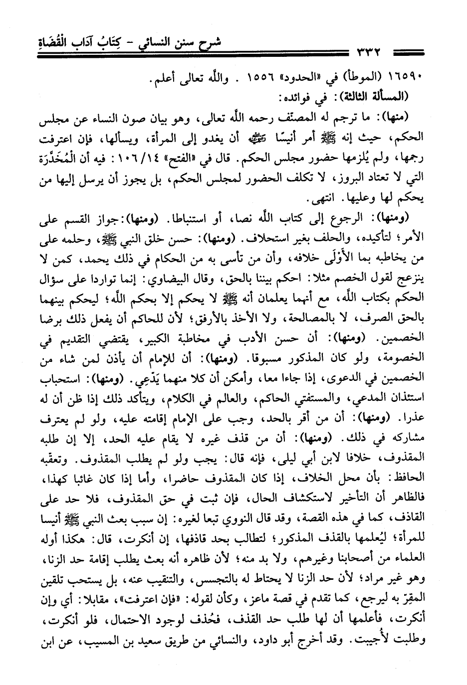 (ومنها): الرجوع إلى كتاب لله نصا، أو استنباطا. (ومنها): جواز القسم عَلَى الأمر؛ لتأكيده، والحلف بغير استحلاف. (ومنها): حسن خلق النبيّ -صلى الله عليه وسلم-، وحلمه عَلَى منْ يخاطبه بما الأَوْلَى خلافه، وأن منْ تأسى به منْ الحكام فِي ذلك يحمد، كمن لا ينزعج لقول الخصم مثلا: احكم بيننا بالحق، وَقَالَ البيضاوي: إنما تواردا عَلَى سؤال الحكم بكتاب الله، مع أنهما يعلمان أنه -صلى الله عليه وسلم- لا يحكم إلا بحكم الله؛ ليحكم بينهما بالحق الصرف، لا بالمصالحة، ولا الأخذ بالأرفق؛ لأن للحاكم أن يفعل ذلك برضا الخصمين. (ومنها): أن حسن الأدب فِي مخاطبة الكبير، يقتضي التقديم فِي الخصومة، ولو كَانَ المذكور مسبوقا. (ومنها): أن للإمام أن يأذن لمن شاء منْ الخصمين فِي الدعوى، إذا جاءا معا، وأمكن أن كلا منهما يَدّعِي. (ومنها): استحباب استئذان المدعي، والمستفتي الحاكم، والعالم فِي الكلام، ويتأكد ذلك إذا ظن أن له عذرا. (ومنها): أن منْ أقر بالحد، وجب عَلَى الإِمام إقامته عليه، ولو لم يعترف مشاركه فِي ذلك. (ومنها): أن منْ قذف غيره لا يقام عليه الحد، إلا إن طلبه المقذوف، خلافا لابن أبي ليلى، فإنه قَالَ: يجب ولو لم يطلب المقذوف. وتعقّبه الحافظ: بأن محل الخلاف، إذا كَانَ المقذوف حاضرا، وأما إذا كَانَ غائبا كهذا، فالظاهر أن التأخير لاستكشاف الحال، فإن ثبت فِي حق المقذوف، فلا حد عَلَى القاذف، كما فِي هذه القصة، وَقَدْ قَالَ النوويّ تبعا لغيره: إن سبب بعث النبيّ -صلى الله عليه وسلم- أنيسا للمرأة؛ ليُعلمها بالقذف المذكور؛ لتطالب بحد قاذفها، إن أنكرت، قَالَ: هكذا أوله العلماء منْ أصحابنا وغيرهم، ولابد منه؛ لأن ظاهره أنه بعث يطلب إقامة حد الزنا، وهو غير مراد؛ لأن حد الزنا لا يحتاط له بالتجسس، والتنقيب عنه، بل يستحب تلقين المقِرّ به ليرجع، كما تقدّم فِي قصة ماعز، وكأن لقوله: "فإن اعترفت"، مقابلا: أي وإن أنكرت، فأعلمها أن لها طلب حد القذف، فحُذف لوجود الاحتمال، فلو أنكرت، وطلبت لأُجيبت. وَقَدْ أخرج أبو داود، والنسائي منْ طريق سعيد بن المسيب، عن ابن