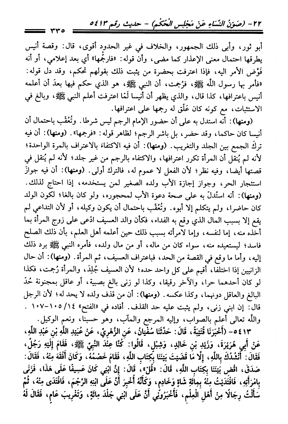 5413 - (أَخْبَرَنَا قُتَيْبَةُ، قَالَ: حَدَّثَنَا سُفْيَانُ، عَنِ الزُّهْرِيِّ، عَنْ عُبَيْدِ اللَّهِ بْنِ عَبْدِ اللَّهِ، عَنْ أَبِي هُرَيْرَةَ، وَزَيْدِ بْنِ خَالِدٍ، وَشِبْلٍ، قَالُوا: كُنَّا عِنْدَ النَّبِيِّ -صلى الله عليه وسلم-، فَقَامَ إِلَيْهِ رَجُلٌ، فَقَالَ: أَنْشُدُكَ بِاللَّهِ، إِلاَّ مَا قَضَيْتَ بَيْنَنَا بِكِتَابِ اللَّهِ، فَقَامَ خَصْمُهُ، وَكَانَ أَفْقَهَ مِنْهُ، فَقَالَ: صَدَقَ، اقْضِ بَيْنَنَا بِكِتَابِ اللَّهِ، قَالَ: "قُلْ"، قَالَ: إِنَّ ابْنِي كَانَ عَسِيفًا عَلَى هَذَا، فَزَنَى بِامْرَأَتِهِ، فَافْتَدَيْتُ مِنْهُ بِمِائَةِ شَاةٍ وَخَادِمٍ، وَكَأَنَّهُ أُخْبِرَ أَنَّ عَلَى ابْنِهِ الرَّجْمَ، فَافْتَدَى مِنْهُ، ثُمَّ سَأَلْتُ رِجَالاً مِنْ أَهْلِ الْعِلْمِ، فَأَخْبَرُونِي أَنَّ عَلَى ابْنِي جَلْدُ مِائَةٍ، وَتَغْرِيبُ عَامٍ، فَقَالَ لَهُ