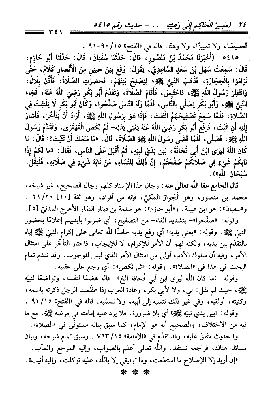 5415 - (أَخْبَرَنَا مُحَمَّدُ بْنُ مَنْصُورٍ، قَالَ: حَدَّثَنَا سُفْيَانُ، قَالَ: حَدَّثَنَا أَبُو حَازِمٍ، قَالَ: سَمِعْتُ سَهْلَ بْنَ سَعْدٍ السَّاعِدِيَّ، يَقُولُ: وَقَعَ بَيْنَ حَيَّيْنِ مِنَ الأَنْصَارِ كَلاَمٌ، حَتَّى تَرَامَوْا بِالْحِجَارَةِ، فَذَهَبَ النَّبِيُّ -صلى الله عليه وسلم-؛ لِيُصْلِحَ بَيْنَهُمْ، فَحَضَرَتِ الصَّلاَةُ، فَأَذَّنَ بِلاَلٌ، وَانْتُظِرَ رَسُولُ اللَّهِ -صلى الله عليه وسلم-، فَاحْتُبِسَ، فَأَقَامَ الصَّلاَةَ، وَتَقَدَّمَ أَبُو بَكْرٍ رضى الله عنه، فَجَاءَ النَّبِيُّ -صلى الله عليه وسلم-، وَأَبُو بَكْرٍ يُصَلِّي بِالنَّاسِ، فَلَمَّا رَآهُ النَّاسُ صَفَّحُوا، وَكَانَ أَبُو بَكْرٍ لاَ يَلْتَفِتُ فِي الصَّلاَةِ، فَلَمَّا سَمِعَ تَصْفِيحَهُمُ الْتَفَتَ، فَإِذَا هُوَ بِرَسُولِ اللَّهِ -صلى الله عليه وسلم-، أَرَادَ أَنْ يَتَأَخَّرَ، فَأَشَارَ إِلَيْهِ أَنِ اثْبُتْ، فَرَفَعَ أَبُو بَكْرٍ رضى الله عنه يَعْنِي يَدَيْهِ- ثُمَّ نَكَصَ الْقَهْقَرَى، وَتَقَدَّمَ رَسُولُ اللَّهِ -صلى الله عليه وسلم-، فَصَلَّى فَلَمَّا قَضَى رَسُولُ اللَّهِ -صلى الله عليه وسلم- الصَّلاَةَ، قَالَ: "مَا مَنَعَكَ أَنْ تَثْبُتَ؟ "، قَالَ مَا كَانَ اللَّهُ لِيَرَى ابْنَ أَبِي قُحَافَةَ، بَيْنَ يَدَيْ نَبِيِّهِ، ثُمَّ أَقْبَلَ عَلَى النَّاسِ، فَقَالَ: "مَا لَكُمْ إِذَا نَابَكُمْ شَيْءٌ فِي صَلاَتِكُمْ صَفَّحْتُمْ، إِنَّ ذَلِكَ لِلنِّسَاءِ، مَنْ نَابَهُ شَيْءٌ فِي صَلاَتِهِ، فَلْيَقُلْ: سُبْحَانَ اللَّهِ").