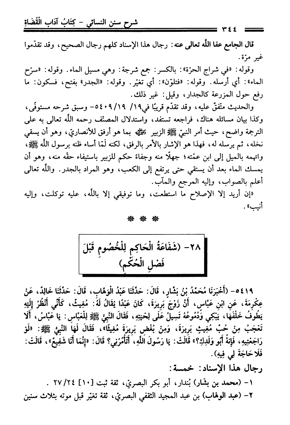 والحديث متّفقٌ عليه، وَقَدْ تقدّم قريباً فِي 19/ 19/ 5409 - وسبق شرحه مستوفًى، وكذا بيان مسائله هناك، فراجعه تستفد، واستدلال المصنّف رحمه الله تعالى به عَلَى الترجمة واضح، حيث أمر النبيّ -صلى الله عليه وسلم-الزبير -رضي الله عنه- بما هو أرفق للأنصاريّ، وهو أن يسقي نخله، ثم يرسله له، فهذا هو الإشار بالأمر بالرفق، لكنه لَمّا أساء ظنه برسول الله -صلى الله عليه وسلم-، واتهمه بالميل إلى ابن عمّته؛ جهلاً منه وجفاءً حكم للزبير باستيفاء حقّه منه، وهو أن يمسك الماء بعد أن يستقي حَتَّى يرتفع إلى الكتب، وهو المراد بالجدر. والله تعالى أعلم بالصواب، وإليه المرجع والمآب.