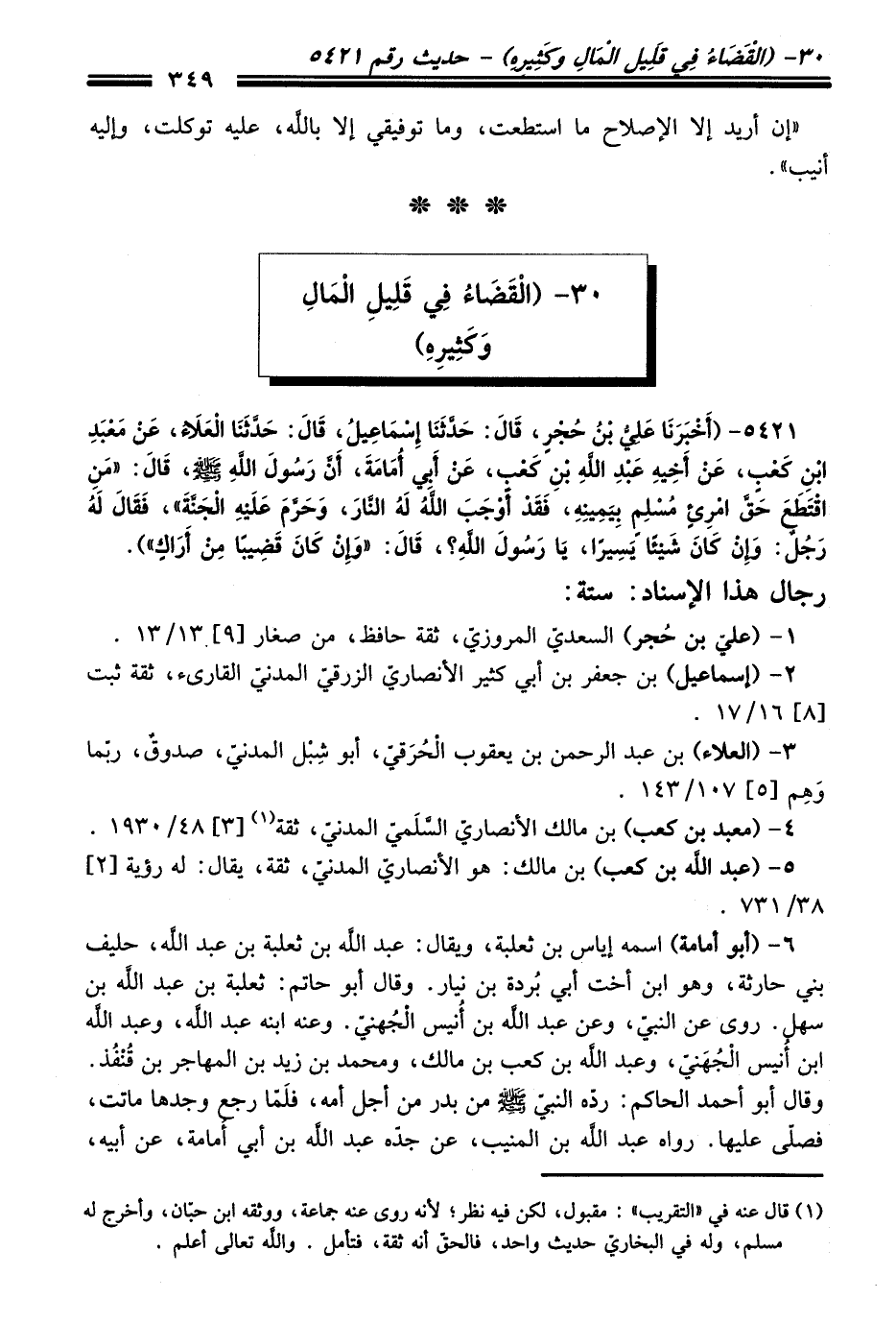 5421 - (أَخْبَرَنَا عَلِيُّ بْنُ حُجْرٍ، قَالَ: حَدَّثَنَا إِسْمَاعِيلُ، قَالَ: حَدَّثَنَا الْعَلاَءُ، عَنْ مَعْبَدِ بْنِ كَعْبٍ، عَنْ أَخِيهِ عَبْدِ اللَّهِ بْنِ كَعْبٍ، عَنْ أَبِي أُمَامَةَ، أَنَّ رَسُولَ اللَّهِ -صلى الله عليه وسلم-، قَالَ: "مَنِ اقْتَطَعَ حَقَّ امْرِىءٍ مُسْلِمٍ بِيَمِينِهِ، فَقَدْ أَوْجَبَ اللَّهُ لَهُ النَّارَ، وَحَرَّمَ عَلَيْهِ الْجَنَّةَ"، فَقَالَ لَهُ رَجُلٌ: وَإِنْ كَانَ شَيْئًا يَسِيرًا، يَا رَسُولَ اللَّهِ؟ قَالَ: "وَإِنْ كَانَ قَضِيبًا مِنْ أَرَاكٍ").