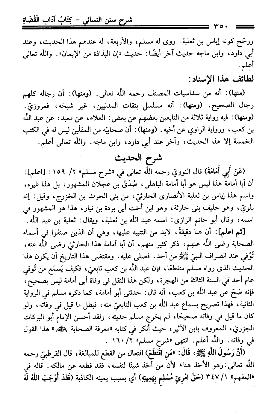 [ثم اعلم]: أن هنا دقيقةً، لابد منْ التنبيه عليها، وهي أن الذين صنفوا فِي أسماء الصحابة رضي الله عنهم، ذكر كثير منهم، أن أبا أمامة هَذَا الحارثيّ رضي الله عنه، تُوُفي عند انصراف النبيّ -صلى الله عليه وسلم- منْ أحد، فصلى عليه، ومقتضى هَذَا التاريخ أن يكون هَذَا الْحَدِيث الذي رواه مسلم منقطعًا، فإن عبد الله بن كعب تابعيّ، فكيف يَسمَع منْ تُوفي عام أحد فِي السنة الثالثة منْ الهجرة، ولكن هَذَا النقل فِي وفاة أبى أمامة ليس بصحيح، فإنه صَحّ عن عبد الله بن كعب، أنه قَالَ: حدثني أبو أمامة، كما ذكره مسلم فِي الرواية الثانية، فهذا تصريح بسماع عبد الله بن كعب التابعيّ منه، فبطل ما قيل فِي وفاته، ودو كَانَ ما قيل فِي وفاته صحيحًا، لم يخرج مسلم حديثه، ولقد أحسن الإِمام أبو البركات الجزريّ، المعروف بابن الأثير، حيث أنكر فِي كتابه "معرفة الصحابة -رضي الله عنهم-" هَذَا القول فِي وفاته. والله أعلم. انتهى "شرح مسلم" 2/ 160.